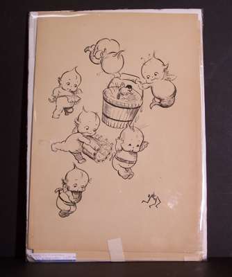 Pen and ink drawings of kewpies, all signed: the first with six kewpies surrounding a bucket of water, one holding a gun, one looking shy, one a reduced version of the previous two, one reclining in a palm of a hand, one in the lap of a fairy, one with a cat and a baby with the caption "anybody can have this orphan", from 45 x 31cm to 65 x 50cm