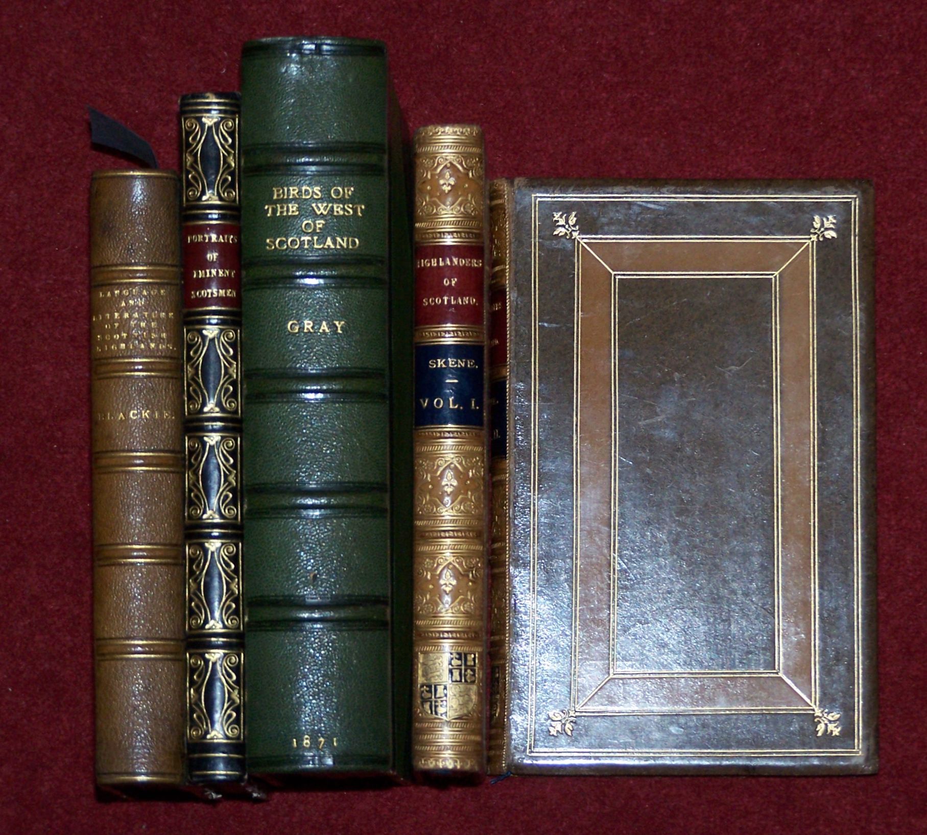The highlanders of Scotland. London: J. Murray, 1837. First edition, 2 volumes, 8vo, contemporary panelled calf gilt, spine gilt with arms of William L MacBrayne at foot, t.e.g., others uncut, bookplates of W.L. MacBrayne; Gray, Robert The birds of the west of Scotland. Glasgow: T. Murray, 1871. First edition, 8vo, 15 plates, green half morocco, t.e.g., plates lightly spotted; Portraits of eminent Scotsmen. 8vo, 44 engraved plates, no text, contemporary half calf gilt; Blackie, J.S. The language and literature of the Scottish highlands. Edinburgh: Edmonston & Douglas, 1876. 8vo, green half morocco, spine faded (5)