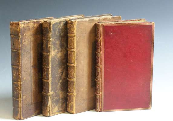 A tale of a tub. London, 1704. Second edition, 8vo [including] A full and true account of the Battel fought last Friday, between the ancient and the modern books in St. James's library, contemporary panelled calf, rubbed at edge; Stone, Edmund Euclid's elements of geometry. London, 1728. 8vo, advertisement leaf at rear, contemporary calf, hinges splitting, rubbed, foxing; King, W. The art of love in imitation of Ovid... London, [no date]. 8vo, frontispiece, contemporary paneled calf, hinges cracking, rubbed; Goldsmith, Oliver The vicar of Wakefield. London, 1797. New edition, 8vo, later red morocco by Riviere, rubbed at edges; Jennings, Rev. David Jewish antiquities. London, 1766. 8vo, 2 volumes, contemporary calf, hinges cracking; [Ainslie, H.] A pilgrimage to the land of Burns. Deptford, 1822. 8vo, frontispiece, eratta slip, original boards, hinges strengthened inside and out; Buxtorf, J. Synagoga Judaica. Frankfurt, 1738. 16mo, title in red and black, contemporary calf, worn, pencil notes throughout; Wierx, H. A series of 13 small engravings by Hieronymous Wierx. [No place, no date], each approx 10.5 x 7cm, modern cloth; and 5 others (13)