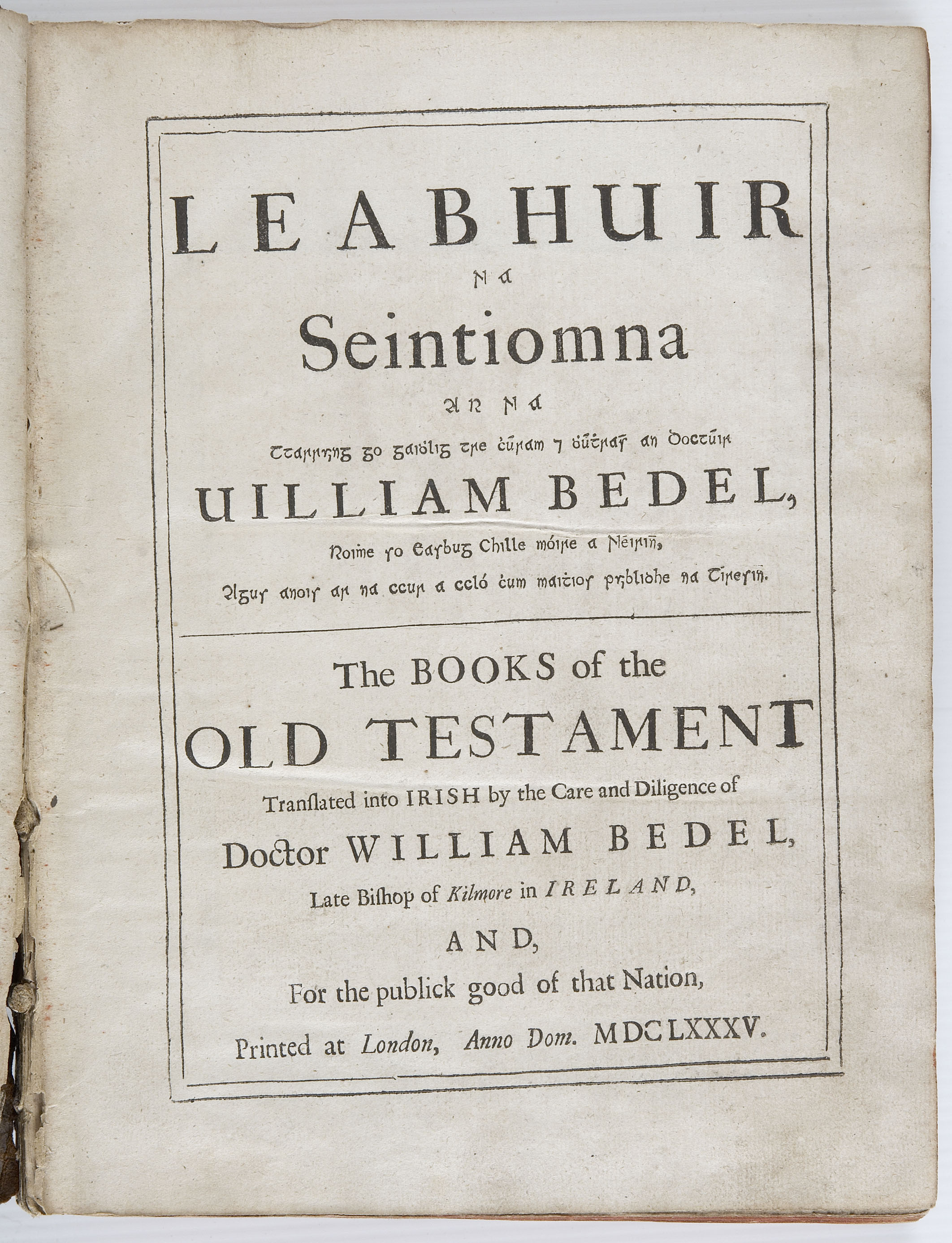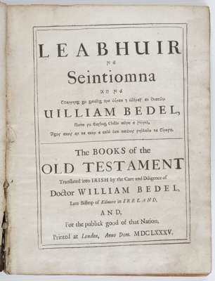 William Bedel (1571-1642), a native of Essex, became Bishop of Kilmore and Ardagh in 1629. At the Church of Ireland Synod of 1634 he proposed a translation of the Old Testament into Irish to complement Uilleam Ó Domhnaill's translation of the New Testament, which had appeared in 1602. He employed Muircheartach Ó Cionga and an assistant, Séamus Ó Nógla to make a translation based on the King James Bible. Bedel, a considerable Irish scholar himself, reviewed and corrected their translation with reference to other versions of the Bible. The translation was completed by 1640 but before it could be published a rebellion broke out. The hardships that Bedel suffered during the rebellion contributed to his death on 7 February 1641. The manuscript of the translation was rescued by Bedel's friend Donnchadh Sioradáin who gave it to Archbishop Narcissus Marsh. Archbishop Marsh, with the aid of the Jesuits, Andrew Sall and Paul Higgins, revised the translation and brought it to a state ready for publication. Its publication, in an edition of around 500 copies, and the typeface used to print it were financed by Robert Boyle. (Cahill, Hugh Other languages of the British Isles, 2004)