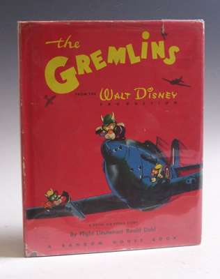 The gremlins. New York: Random House, 1943. First edition of the author's first book, folio, one double-page and 12 full-page coloured illustrations and other illustrations in the text by Walt Disney studios, original cloth-backed pictorial boards, illustrated endpapers, dust-jacket, corners of boards slightly frayed, price-clipped dust-jacket frayed at extremities with loss to head and foot of spine, together with loss to lower cover of dust-jacket