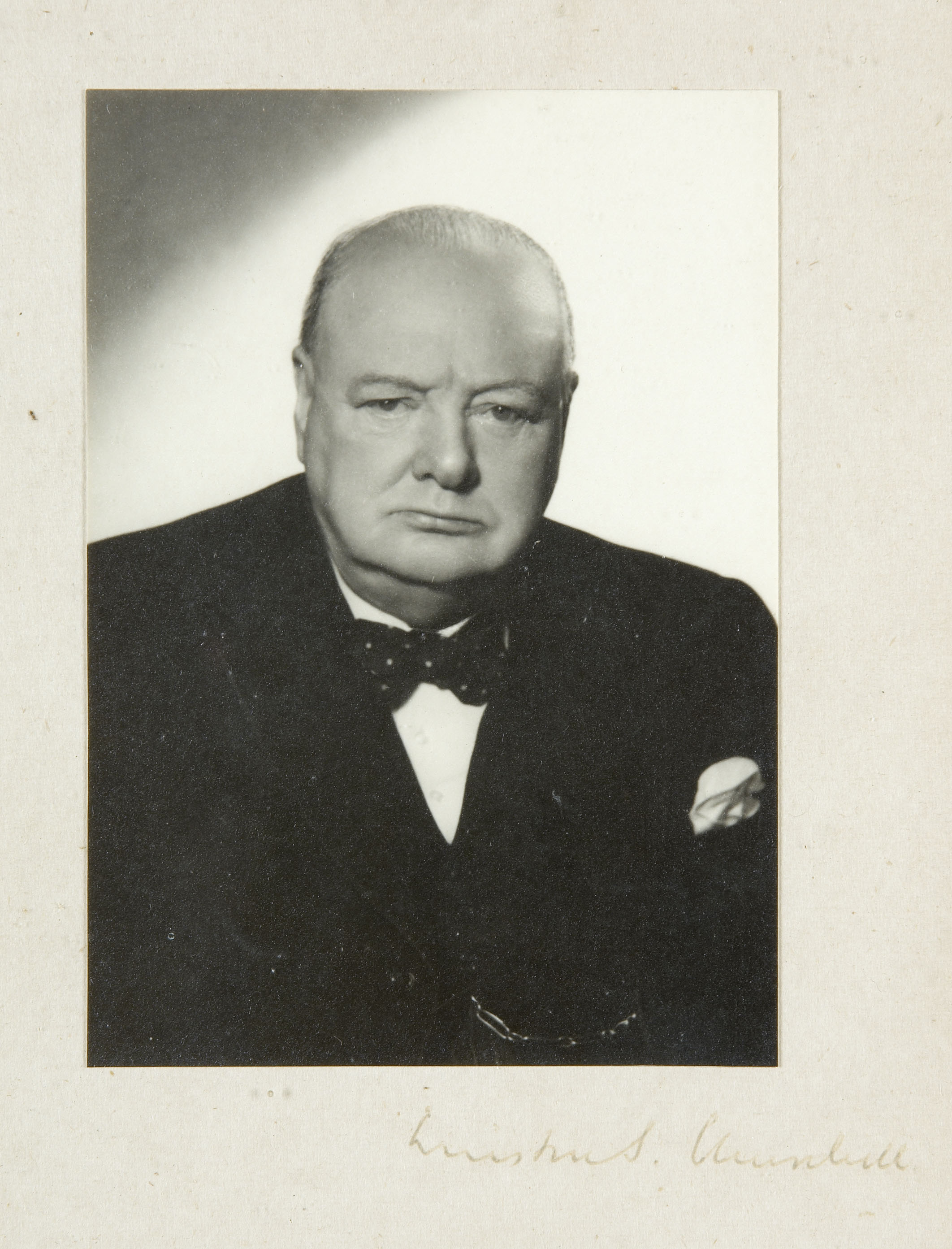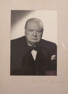 Provenance: Ink inscription on rear of frame reads "This photograph was sent to me by Sir Winston Churchill in 1950 when he was invited to attend a reunion dinner of the Scottish Returned Far East POW Asociation of which I was chairman. [signed] J. Telfer Dunbar". Pasted alongside the inscription is a letter from Mr. Churchill's secretary, dated 26th January 1951, sending apologies for not being able to accept the dinner invitation.