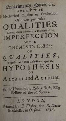 Experiments, notes &c about hte mechanical origine or production of divers particular qualities. London: E. Flesher for R. Davis, 1676. First edition, second issue, 8vo, 11 parts in one volume, 11 parts in one volume, 8vo (17 x 10.6cm.), contemporary calf, blind double-fillet border, blind-stamped corner fleurons, modern lettering-piece, lacking blank B8 in part one, binding rubbed, upper hinge cracking