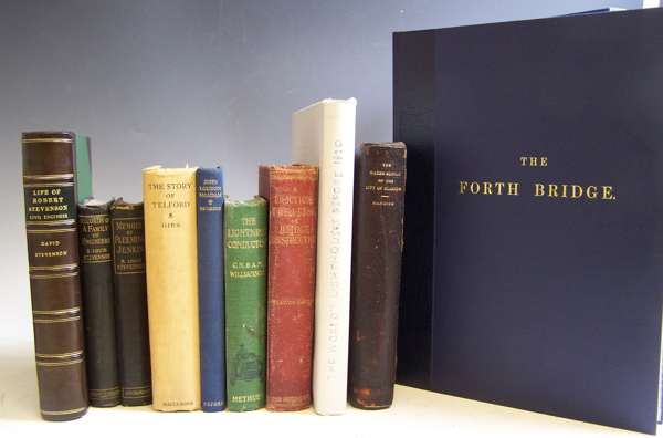 Life of Robert Stevenson. Edinburgh, 1878. 4to, presentation inscription from author on half title, portrait frontispiece, 12 plates, last leaf repaired, modern half calf gilt, original cloth bound in at rear, some browning to page edges; Westhofen, Wilhelm The Forth Bridge. Edinburgh, 1989. Centenary edition, 4to, number 168 of 2500 copies, quarter blue morocco gilt, slipcase, a fine copy; Stevenson, R.L. Records of a family of engineers. London, 1912. 8vo, original blue cloth gilt; [Ibid.] Memoir of Fleeming Jenkin. London, 1912. 8vo, portrait frontispiece, original cloth gilt, library stamps; Gibb, Sir Alexander The story of Telford. London, 1935. 8vo, illustrated, original cloth; Devereux, Roy John Loudon McAdam, chapters in the history of highways. London, 1936. 8vo, frontispiece, original cloth gilt, previous owner's inscription on endpaper; Williamson, C.N. & A.M. The lightning conductor, the strange adventures of a motor-car. London, 1905. Eleventh edition, 8vo, illustrated, original green cloth, cocked; Fidler, T. Claxton A practical treatise on bridge-construction. London, 1901. Third edition, 8vo, original cloth, rubbed, inner hinges splitting; Stevenson, Dr. Alan The world's lighthouses before 1820. London, 1959. First edition, 4to, original cloth, dustwrapper, a fine copy; and 41 others (including 5 on aviation) (50)
