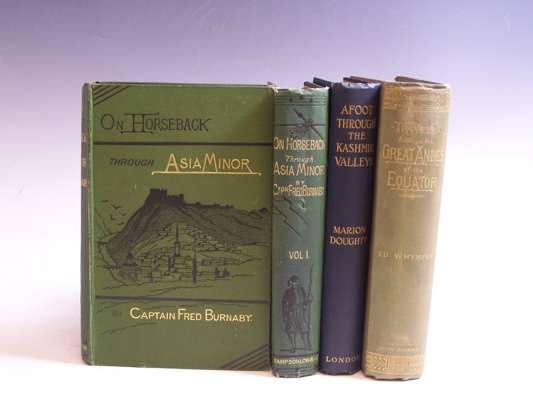 On horseback through Asia Minor. London: Sampson Low, et al., 1877. First edition, 8vo, 2 volumes, portrait frontispiece, three folding maps, original decorative green cloth gilt, small hole in spine of volume I; Whymper, Edward Travels amongst the Great Andes of the Equator. London, 1892. 8vo, folding map in pocket at rear, original green cloth gilt, boards faded; Doughty, Marion Afoot through the Kashmir valleys. London, 1901. 8vo, illustrated, original blue cloth gilt (4)