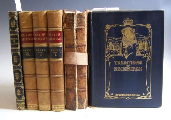 Modern Athens, displayed in a series of views or Edinburgh in the nineteenth century. London, 1829. 4to, engraved title page, 48 engraved plates mostly with 2 views, tissue guards, contemporary half blue calf gilt, some slight rubbing at edges, interior clean; Grant, James Old and new Edinburgh. London, [no date]. 4to, 3 volumes, illustrated, contemporary half calf gilt, red and black labels, hinges cracking; Chambers, Robert Traditions of Edinburgh. London, 1912. 4to, colour plates, original blue cloth gilt; Arnot, Hugo The history of Edinburgh. Edinburgh, 1788. 4to, folding map, 18 [of 19] plates, browned and torn, contemporary calf, worn, boards loose, several leaves loose (6)