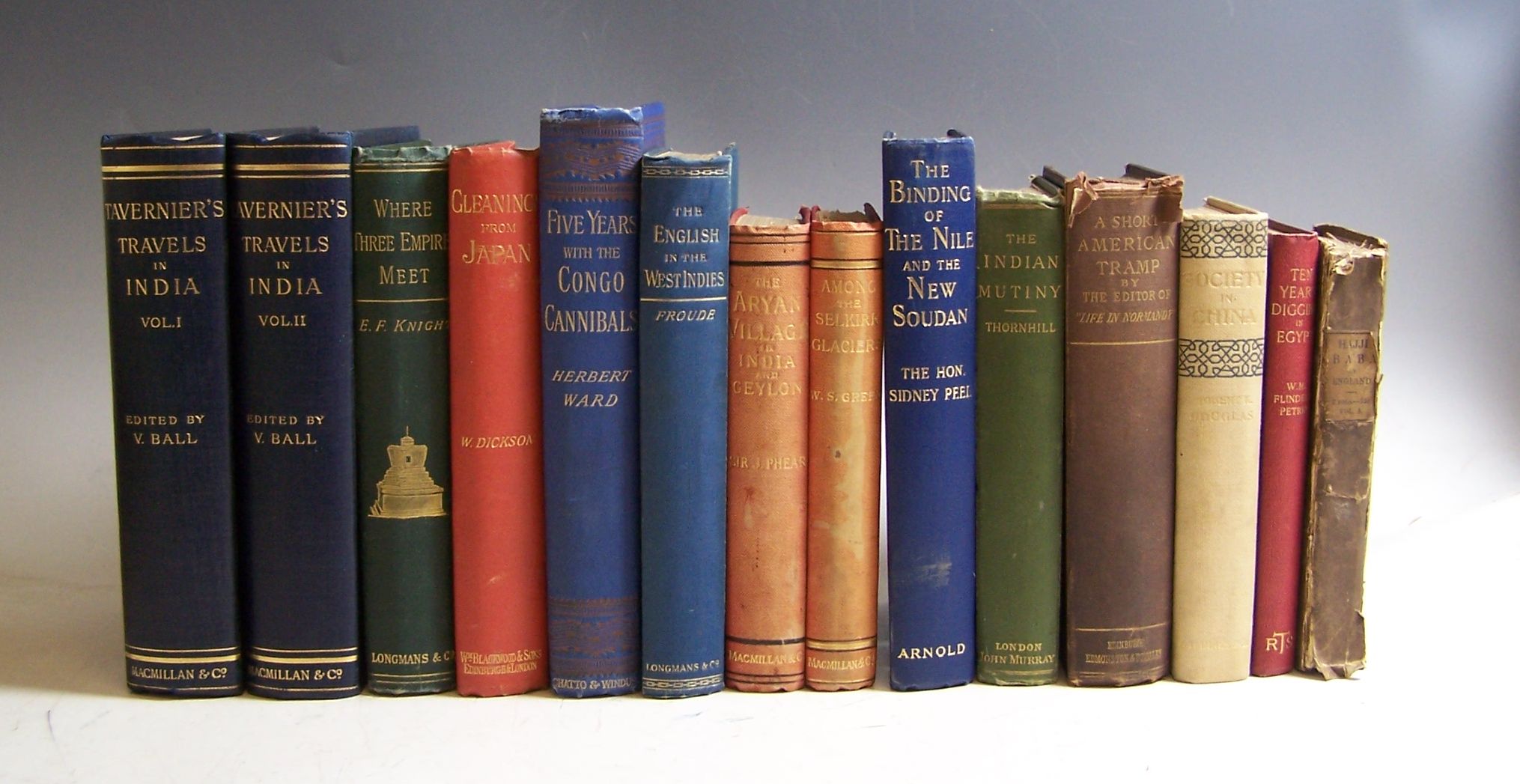 Travels in India, edited by V. Ball. London: 1889. 2 volumes, 8vo, original cloth gilt; Peel, S. The binding of the Nile. London: 1894. 8vo, plates, original cloth; Thornhill, Mark The personal adventures and experiences of a magistrate during... the Indian mutiny. London: 1884. 8vo, plates, original cloth; Knight, E.F. Where three empires meet. London: 1893. Second edition, 8vo, map, plates, original pictorial cloth gilt; Dickson, W.g. Gleanings from Japan. Edinburgh: 1889. 8vo, original pictorial cloth; Ward, Herbert Five years with the Congo cannibals. London: 1890. Second edition, 8vo, illustrations, original pictorial cloth; Froude, J.A. The English in the West Indies. London: 1888. 8vo, original pictorial cloth; Phear, J.B. The Aryan village in India and Ceylon. London: 1880. 8vo, original cloth, spine faded; Green. W.S. Among the Selkirk glaciers. London: 1890. 8vo, original cloth, spine faded; and 4 others (14)