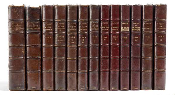 A la recherche de temps perdu. Paris: Bernard Grasset (Editions de la nouvelle revue Francaise), 1914-1927. 13 volumes, 12mo (185 x 117mm.), contemporary morocco-backed boards (volumes 1-9), later near-uniform morocco-backed boards (volumes 10-13), original printed wrappers bound in, partly unopened, occasional light spotting and damp-staining, a few joints cracked (13)