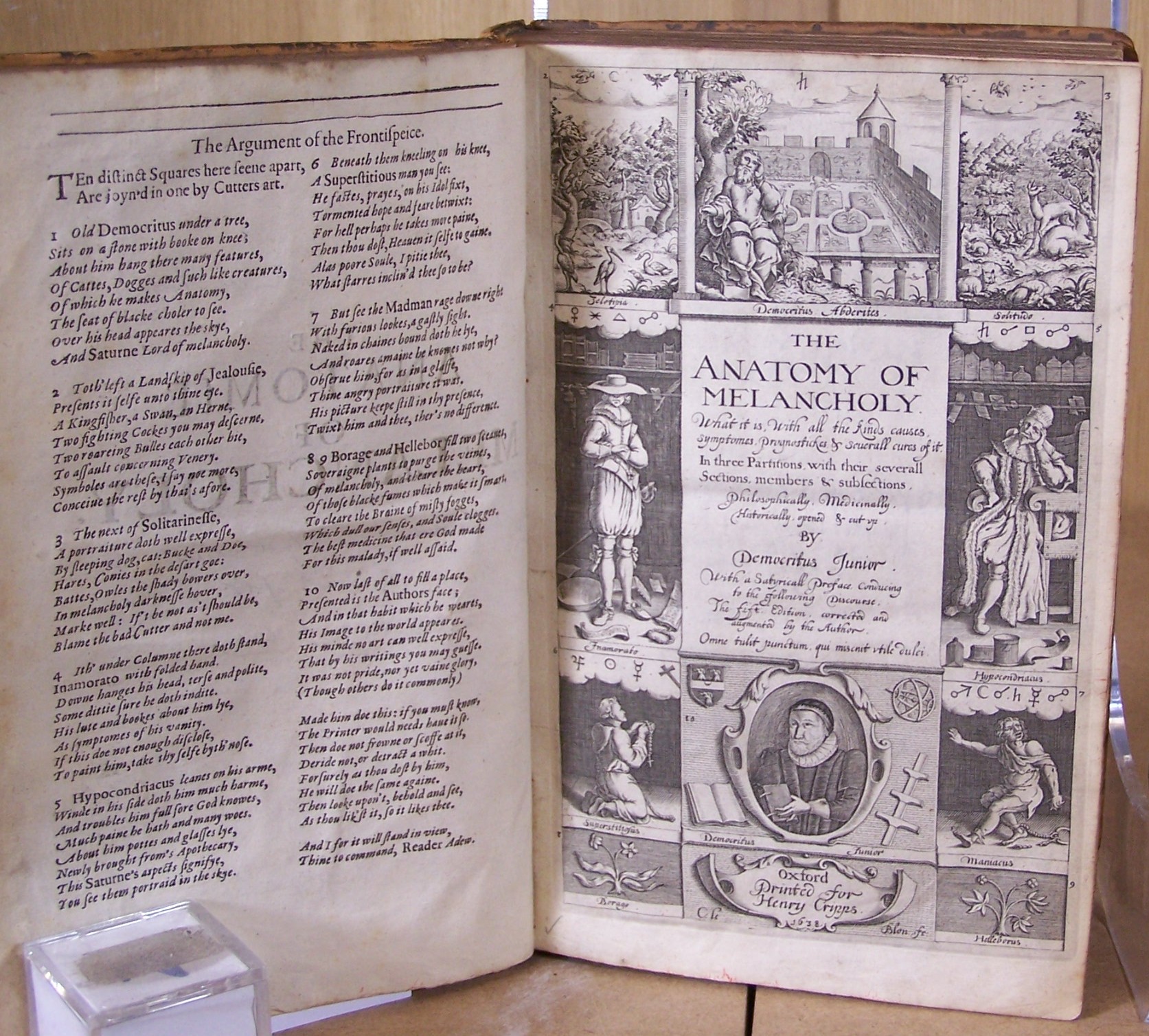 The anatomy of melancholy. What it is... the fifth edition. Oxford: Printed for Henry Cripps, 1638. 4to, engraved title by C. le Blon, woodcut ornaments and initials, contemporary calf, rebacked, half-title/Argument of the Frontispiece leaf, lacking cancelled leaf Ll 1, half title with contemporary ink notes, some light foxing to page edges, replacement endpapers