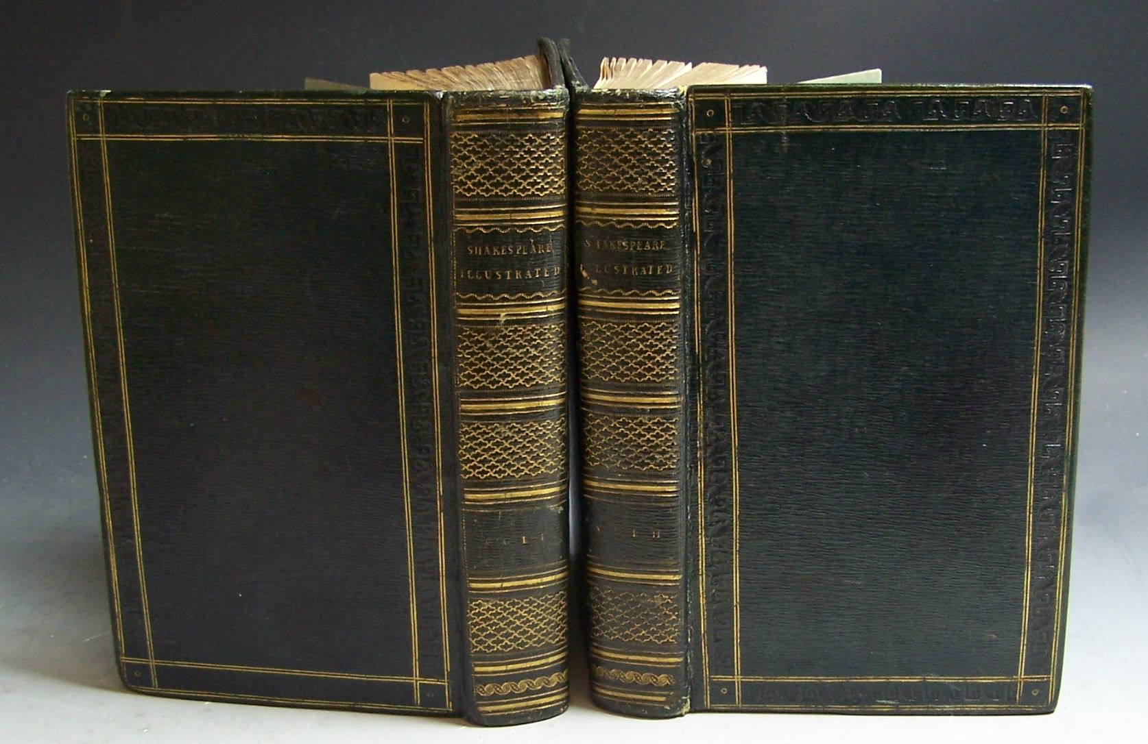 Shakespeare illustrated by an assemblage of portraits and views. London: G. Sidney, 1793. 2 volumes, 8vo, 158 engraved plates, contemporary dark blue morocco, sides with blind-stamped and gilt ruled border, each volume with a fore-edge painting, one depicting a man punting across a river with church and house beyond, the other with a man walking along a country lane with cottages beyond, both initialled J.E. and dated 1799, slight spotting