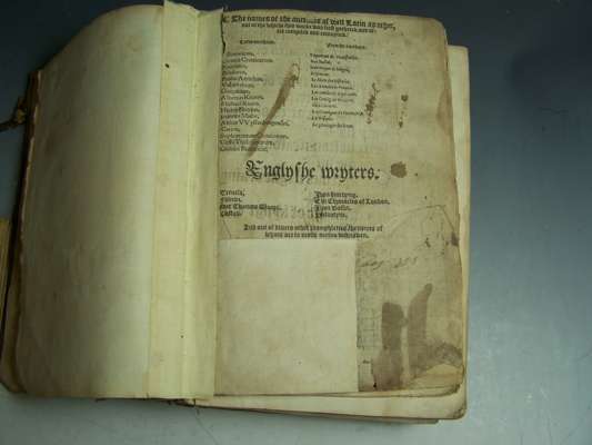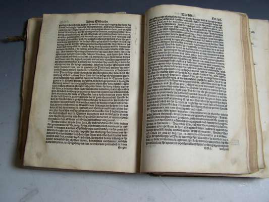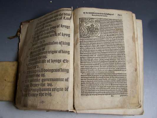 [The union of two noble and illustre families of Lancastre and Yorke. [London: Grafton, 1548]. Folio, black letter, woodcut initials, seventeenth century calf, lacks title, 2 leaves of dedication and final leaf [folio 263], *4 crudely repaired with loss, marginal repairs to A1, some soiling, scattered worming, principally at beginning, margins dampstained throughout, corner of DDD2 torn away with some loss of text, margin of B1 cropped, EE1 torn without loss, KK1 torn and partly repaired, very worn, spine split, covers detached