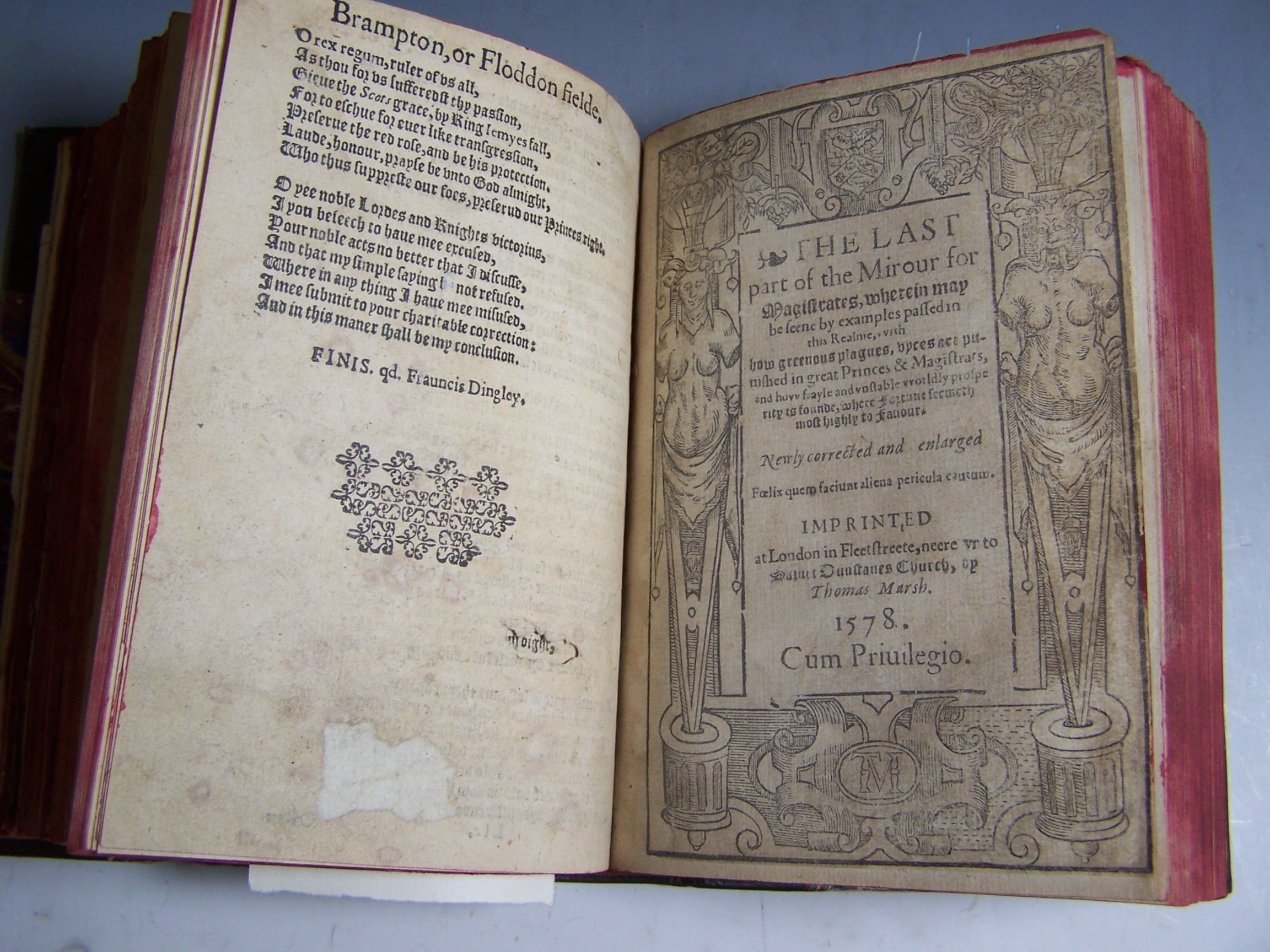 [Mirour for Magistrates. London: T. Marshe, 1574-78]. 8vo, 2 parts in one volume, black letter, woodcut titles to second and last part, possibly from another copy, woodcut initials, nineteenth century half morocco, first part lacking title and folios 49-55, 169-177, 185, 192, 241-248, 250-256; part 2 lacking folios 1, 91, 149-152, 158-172, several leaves possibly inserted from another copy, folio 140 and 146 repaired wtih loss of a couple of letters, last 2 leaves of part 2 repaired with slight loss; sold not subject to return