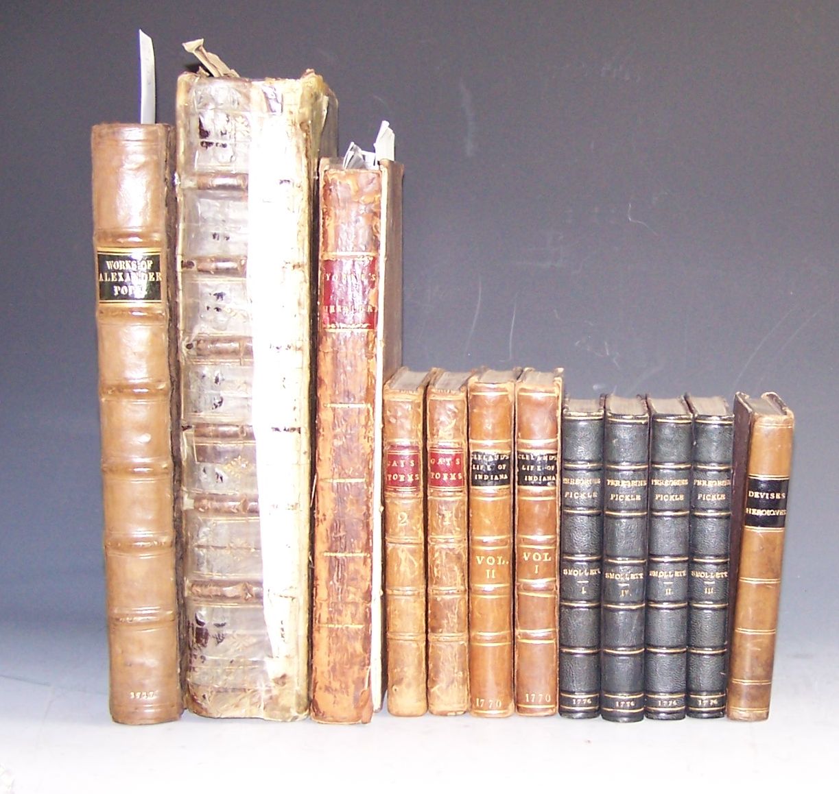 The virtuous orphan. London: L. Hawes &c., 1770. Fifth edition, 2 volumes, 12mo, 3 engraved plates, contemporary calf, the plates slightly cut down, rebacked; Gay, John Poems on several occasions. London: J. & R. Tonson, 1762. 2 volumes, 12mo, engraved plates, contemporary calf, slightly rubbed; Smollett, Tobias The adventures of Peregrine Pickle. London: R. Baldwin, 1776. 4 volumes, 12mo, 4 engraved plates, later blue half morocco, one plate repaired with loss, some soiling and spotting; and 5 others, miscellaneous (13)