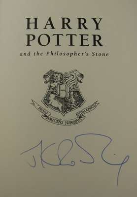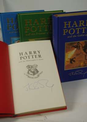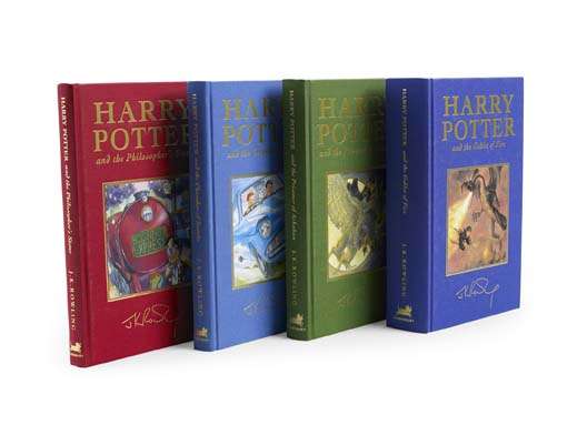Harry Potter and the philosopher's stone. London: Bloomsbury, 1999, First deluxe edition, fifth impression; [Idem] Harry Potter and the chamber of secrets. London: Bloomsbury, 1999. First deluxe edition, fifth impression; [Idem] Harry Potter and the prisoner of Azkaban. London: Bloomsbury, 1999. First deluxe edition, sixth impression; [Idem] Harry Potter and the goblet of fire. London: Bloomsbury, 2000. First deluxe edition, original red, blue, green and purple cloth gilt with laid down illustration on upper board, in publisher's red slipcase, all four signed by J.K. Rowling on the half-title (4)