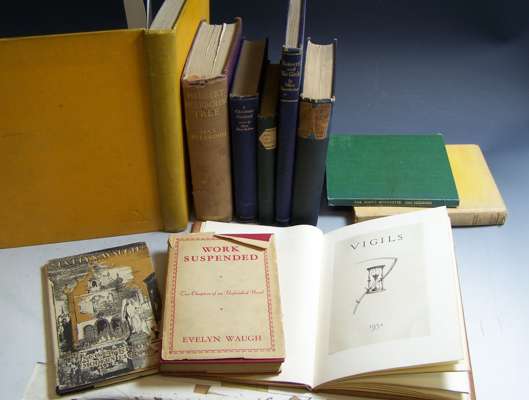 Vigils. [Bristol: Douglas Cleverdon], 1934. Number 93 [of 272 copies], signed by Siegfried Sassoon, frontispiece engraved by Stephen Gooden, poems engraved by C. Sigrist, original tan morocco, tear to lower board, spine darkened; Beerbohm, Sir Max . The happy hypocrite. 1897. Original wrappers frayed, upper wrapper detached; [Idem] Observations. 1925, coloured frontispiece; [Idem] Rossetti and his circle. 1922; [Idem] Herbert Beerbohm Tree. [N.d.], spine worn; [Idem] A Christmas garland. 1912; [Idem] More. 1899; [Idem] Yet again. 1909; [Idem] And even now. 1920; Waugh, Evelyn Work suspended. 1942. First edition, limited to 500 copies, dust-jacket soiled and torn with loss; [Idem] Scott-King's modern Europe. 1947. Dust-jacket worn; and 7 others (18)