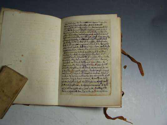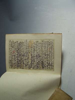 Autograph manuscript diary for 5-6 November 1870 as a besieged resident in Paris, written on small slips of paper pasted onto 9 sheets of paper "The Prussian batteries will carry to the Champ de Mars... meat is getting more & more rare every day... live dogs are becoming scarce", envelope at end addressed to Mr Robinson, 20 Bouverie St., Fleet St. and inscribed "balon monté", franked 2 Oct. 70, late 19th century vellum, ties