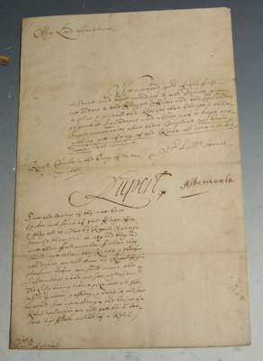 Letter signed to "My Lord & Gentlemen", confirming that he has given orders to the Fflagg officers and the commanders to man and victual the ketches that belong to their respective squadrons and stating "we heare nothing yett of any of the Ketches, wch. were to bee sent downe", bifolium, with loss of half of address panel, Royal Charles in the Bay of the [?] Nau, 7 May 1666, 1 page, signed by Rupert, and the Duke of Albemarle