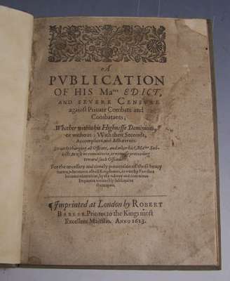 A publication of His Ma[jes]ties edict and severe censure against private combats and combatants. London: Robert Barker, 1613. First edition, 4to, woodcut coat of arms on title verso, boards, without initial blank leaf A1, title soiled and corner repaired, some dampstaining, final leaf repaired affecting two letters