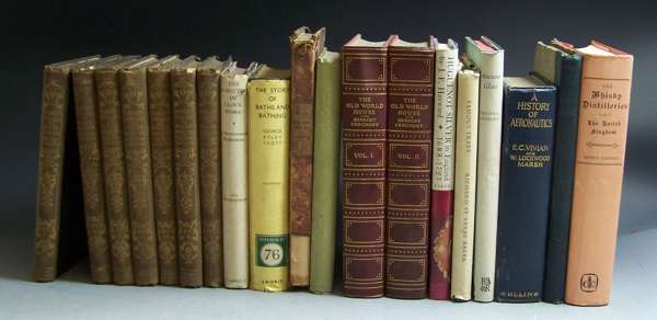 England & Wales delineated. [N.d], Divisions 1-8, 8vo, engraved plates, engraved maps hand-coloured in outline, original cloth, short split to one spine; Robertson, J.D. The evolution of clockwork. 1931. Dust-jacket; Scott, G.R. The story of baths and bathing. 1939. Dust-jacket; Britton, J. The history and antiquities of Bath Abbey, Church. 1825. 8vo, additional engraved title and plates, contemporary half morocco, spine defective; Lilley, A.E. & W. Midgley A book of studies in plant form. 1902. 8vo, original cloth; Cescinsky, H. The old world house. 1924. 2 volumes, large 8vo, original cloth; Hayward, J.F. Huguenot silver in England 1688-1727. 1959. Dust-jacket; Baker, R. St. B. Famous trees. Dropmore Press, 1952. 8vo, limited to 999 copies, original cloth, dust-jacket; Neuberg, F. Ancient glass. 1962. Dust-jacket; Vivian, E.C. A history of aeronautics. 1921. 8vo, original cloth; Fielding, T.H. On the theory of painting. 1836. Second edition, 8vo, 13 (of 14) plates, original cloth-backed boards, rubbed; Barnard, A. The whisky distilleries of the United Kingdom. 1969, original cloth; and 14 others (34)