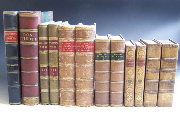Suggestions in design. [c.1880]. 4to, frontispiece and 101 plates, contemporary half calf gilt; Keltie, J.S. A history of the Scottish highlands, highland clans and highland regiments. 1875, 2 volumes, 8vo, engraved and coloured plates, contemporary half calf, slightly rubbed; Hogarth, William The works. [c.1830]. 2 volumes, 4to, engraved titles and 143 [of 148] engraved plates, contemporary calf gilt, a few plates loose; Cervantes Saavedra, M. de The history of Don Quixhote. Cassell, [c.1880]. 4to, plates by G. Doré, red half morocco gilt; Naumann, E. The history of music. [c.1880]. 2 volumes, 8vo, contemprary half calf gilt; Stanyan, T. The Grecian history. 1781. 2 volumes, 8vo, engraved plates and maps, several folding, contemporary tree calf gilt; Smith, James The panorama of science and art. Liverpool, Caxton Press, [1814]. 2 volumes, 8vo, engraved plates, contemporary diced calf, spines gilt, some spotting; Crawfurd, George The peerage of Scotland. Edinburgh, 1716. Folio, contemporary calf, early annotations and deletions on title, some spotting, worn, covers detached; and 6 others (19)