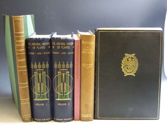 The art & craft of garden making. London, 1900. 4to, later half morocco gilt, "Dillington Park" stamp on upper cover, backstrip faded, interior very clean, bookplate; Evelyn, John Kalendarium hortense... Hackney: Stourton Press, 1983. 4to, number 48 of 350 copies, one of 10 bound in full morocco gilt, a fine copy; Maxwell, Sir Herbert Flowers, a garden note book. Glasgow, 1923. 8vo, number 164 of 200 copies, signed by the publisher, 12 colour plates, original quarter morocco gilt, a fine copy; Kerner von Marilaun, Anton & Oliver, F.W. The natural history of plants. London, 1904. 8vo, 2 volumes, original Talwin Morris cloth gilt, foxing; Lawrence, George A catalogue of Redouteana. Pennsylvania, 1963. 8vo, original paper wrappers (6)