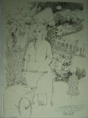 Note: These drawings were probably executed for a portfolio of illustrations published in the 1960s. Each of the main characters in the story is depicted: Sinbad Sailors and Mary Ann the Sailors, Butcher Beynon and Lily Smalls, Captain Cat, Lord Cut-Glass, Mr Waldo, Cherry Owen, Dai Bread, No good Boyo, Willy-Nilly Postman, Myfanwy Price and Mog Edwards, Rev. Eli Jenkins and Polly Garten.