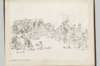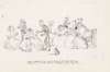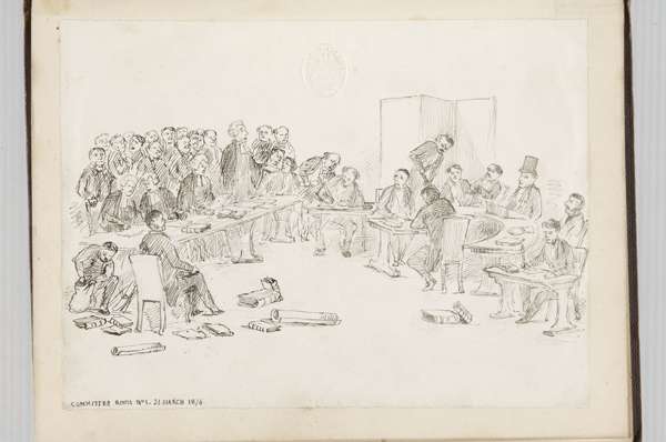This album contains various ink stektches from his final years at the Scottish office, including a sketch of a House of Commons meeting regarding the Caledonian Railway in 1876 that Charles attended in his role at the Office of Works. Other illustrations included various short series all captioned in his distinctive block letters [for comparison see The Doyle Diary, published in 1978]