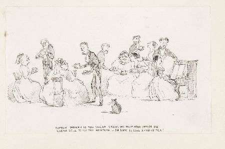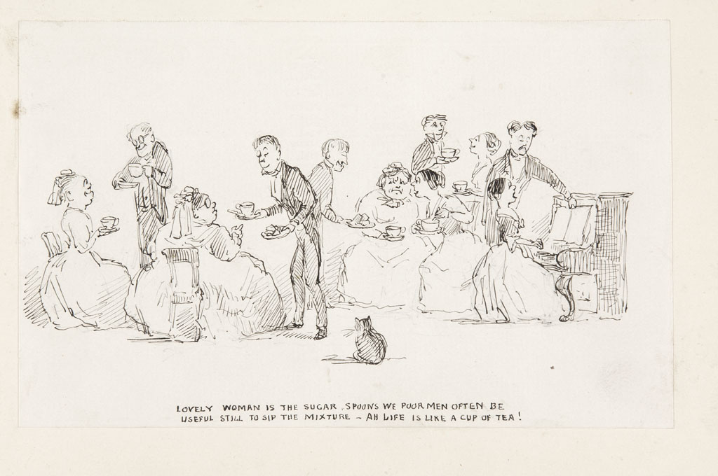 An album of 49 original illustrations thought to be by Charles Altamount Doyle, c. 1868-76, including series of 25 illustrations entitled The seasons, a series of 6 illustrations entitled The story of the wonderful pig that was (to have been) sent to Miss Juilet Reeves as a Christmas gift, a poem and illustration entitled Miss [Antoinette] Stirling ode to the very young gentleman who showed her such devoted attention at a small tea party, a collage of David Livingstone [ink with pasted on engraving of character's face], an ink sketch of a meeting held in Committee Room No. 1 at the House of Commons on 31st March 1876 [discussing the Caledonian Railway], a series of 5 illustrations entitled A song about tea, an ink sketch of an evening service on Good Friday 1876 at St. Ann's in Soho, ink illustrations in the majority pasted onto leaves, various sizes from 10 by11.5cm (at smallest) to 15 by 20cm (at largest), contemporary cloth gilt, rubbed at edges