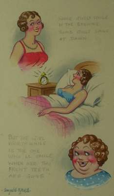 "Some girls smile in the evening, some girls smile at dawn, but the girl worth while is the who'll smile when her two front teeth are gone!". Watercolour and bodycolour, signed by the artist, 24.5 by 15.5cm.; "Old or Young, rich or poor, No one's safe from that tongue of yours. When once it begins to wag, nothing'll stop it but a fag!". Watercolour and bodycolour, signed by the artist, 20.5 by 15cm., framed and glazed (2)