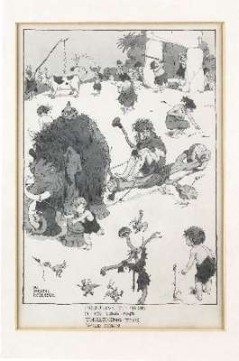 Original pen, ink and monochrome watercolour illustration entitled Primitive methods of cutting and threshing the wild corn, signed, approx 28 by 19.5cm, label on reverse of board, titled in ink Hovis Booklet, number 1786, ink caption on lower edge of board Hovis Booklet, No. 2, framed and glazed