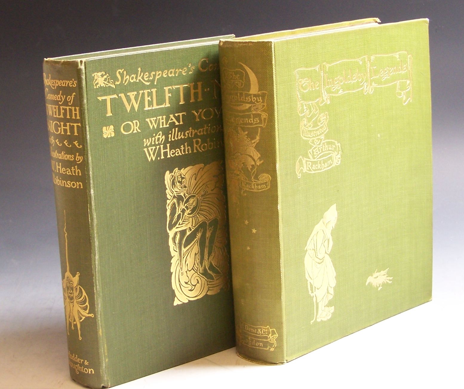 Shakespeare's comedy of Twelfth Night. London, [1908]. 4to, 40 tipped in colour plates, original green cloth gilt, small bookplate on front fixed endpaper; Rackham, Arthur The Ingoldsby legends. London, 1907. 4to, 24 tipped in colour plates, original green cloth gilt, t.e.g., some fading to backstrip (2)