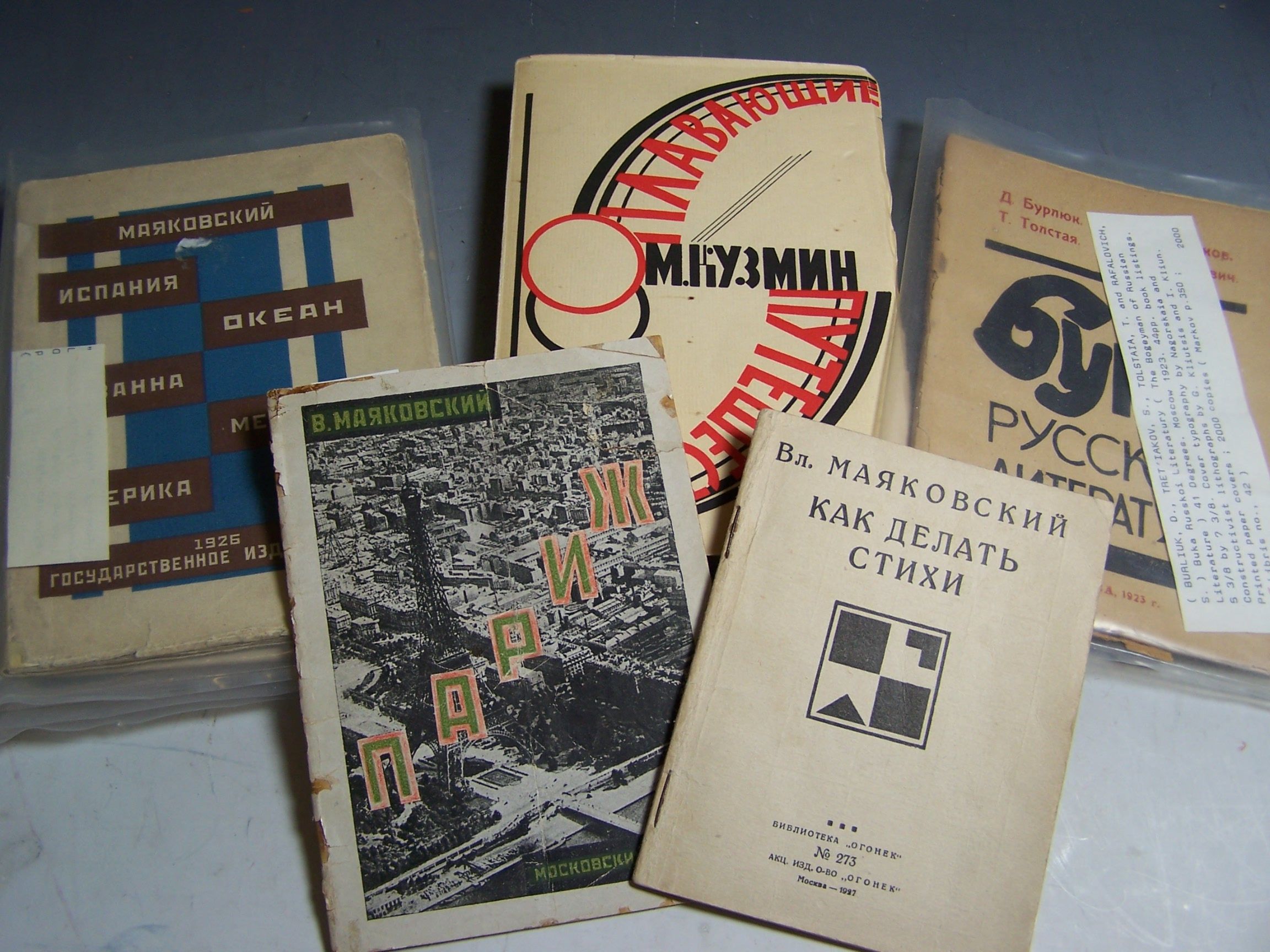 Ot sezanna do suprematizma. Kriticheskii ocherk. [From Cézanne to Suprematism. A critical sketch]. [St. Petersburg]: Izo. N.K.P. [Narkompros Department of Performing Arts], [1920], 12mo (175 x 113mm.), original printed wrappers, small piece of upper wrapper supplied in pen facsimile, indistinct stamp to lower wrapper; Erenburg, I. Lik Voiny [The face of war]. Berlin: Gelikon, 1923. 8vo, original wrappers by N. Altman, text slightly discoloured, slight wear to foot of spine; Burliuk, D., Tretiakov, S., Tolstaya, T. and Rafalovich, S. Buka Russkoi Literatury [The bogeyman of Russian literature]. Moscow: 41 Degrees, 1923. 8vo, illustrations by G. Kliutsis and I. Kliun, original wrappers by Nagorskaia, paper somewhat browned as usual, slight loss to lower wrapper; Mayakovsky, Vladimir Kak delat' stikhi ? [How to write poetry ?]. Moscow: Ogonek, 1927. 12mo, original wrappers; Idem Paris. Moscow: 1925. 12mo, original wrappers by Rodchencko, wrappers a bit rubbed, soiled, upper wrapper laid down, small wormhole in margin; Idem Ispania, Okean, Gavanna, Meksika, Amerika [Spain, Ocean, Havanna, Mexico, America]. Moscow, 1926. 8vo, original wrappers, spine repaired, a few small stamps to lower wrapper; Kuzmin. People who travel by sea. Berlin: Petropolis, 1923. 8vo, original wrappers by Nathan Altman (7)