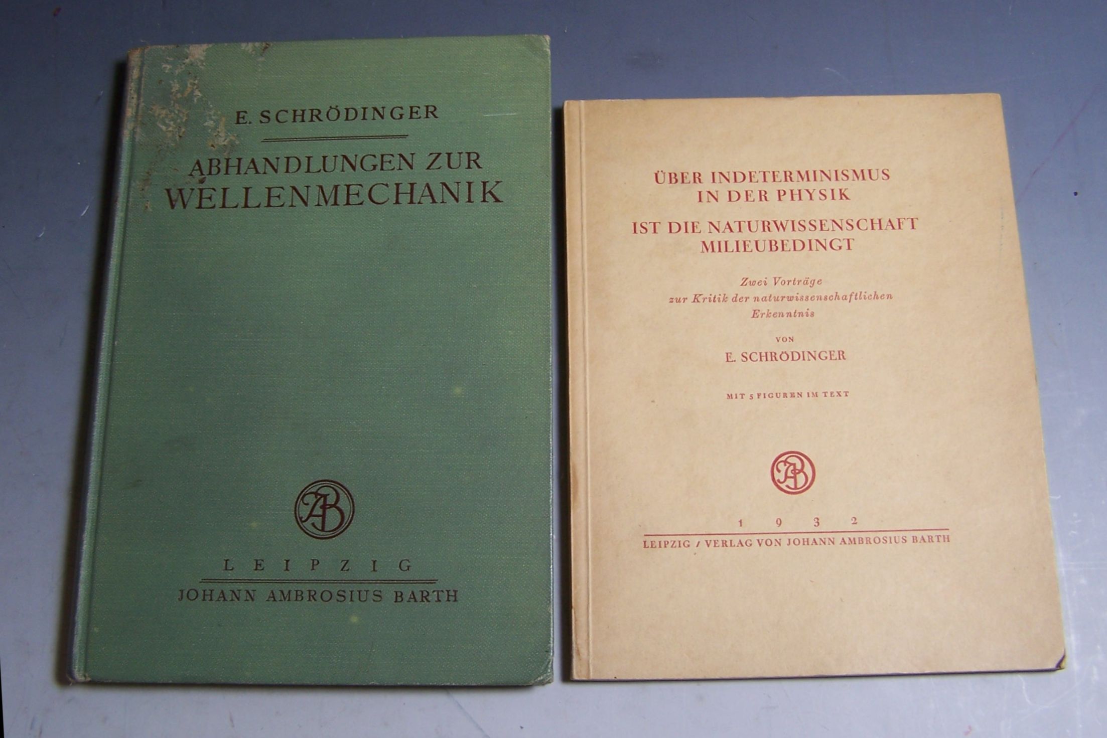 Abhandlungen zur Wellenmechanik. Leipzig: J.A. Barth, 1927. First edition, 8vo, original cloth, upper cover slighlty soiled; Idem. Uber indeterminismus in der Physik. Leipzig: J.A. Barth, 1932. 8vo, original wrappers; Benndorf, H. & V.F. Hess Luftelektrizitat. [N.d.], 8vo, extracted article with pencil dedication to C.T.R. Wilson from the authors, cloth; Ritter, A. Anwendungen der Mechanischen Warmetheorie auf kosmologische Probleme. Hannover, 1879. 8vo, quarter cloth; Zinner, E. Geschichte und Bibliographie der Astronomischen Literatur in Deutschland zur Zeit der Renaissance. Stuttgart, 1964. 8vo, cloth; Eberhard, G. Sternspektrographie und Bestimmung von Radial-Geschwindigkeiten. Berlin, 1933, 8vo, offprint, quarter cloth; and c. 60 others, mostly in wrappers (66)