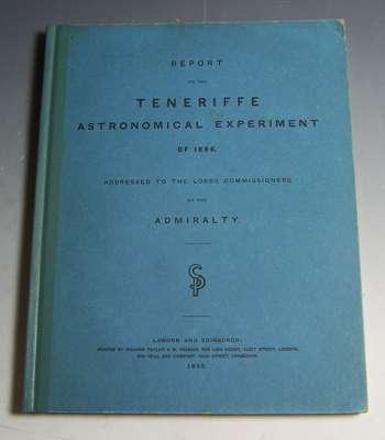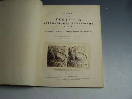 Report on the Teneriffe astronomical experiment of 1856, addressed to the Lords Commissioners of the Admiralty. London & Edinburgh, 1858. First edition, title with mounted stereo photograph, 10 lithographed plates and one mounted albumen print plate, original blue printed boards, neatly rebacked