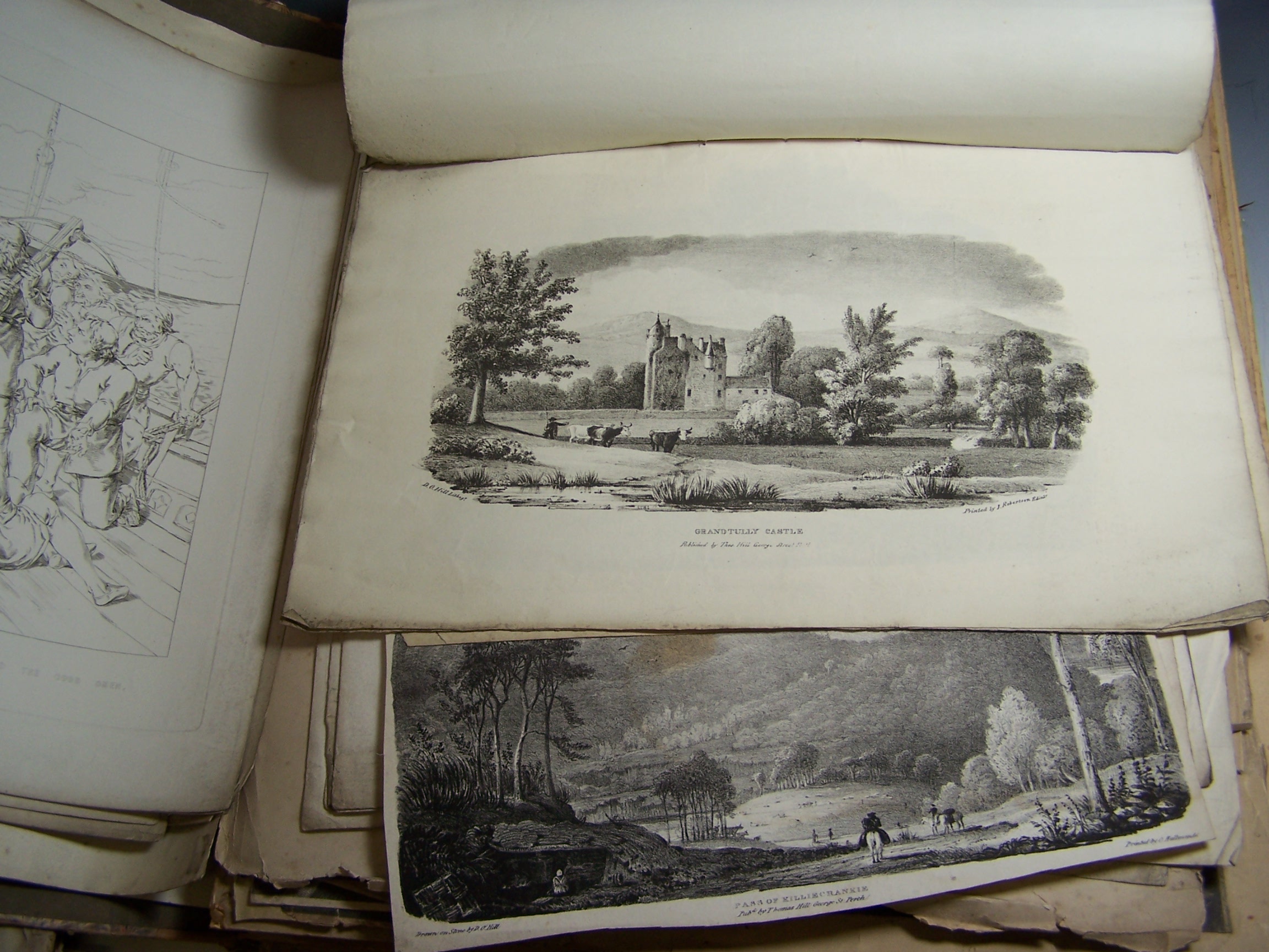 a large quantity, mainly 19th century, after David Scott & others, 7 lithographs of Scottish views after D.O. Hill, portraits of Scottish kings, Scottish views, numerous views after J.M.W. Turner, some on india paper, varying condition in 2 two large folders