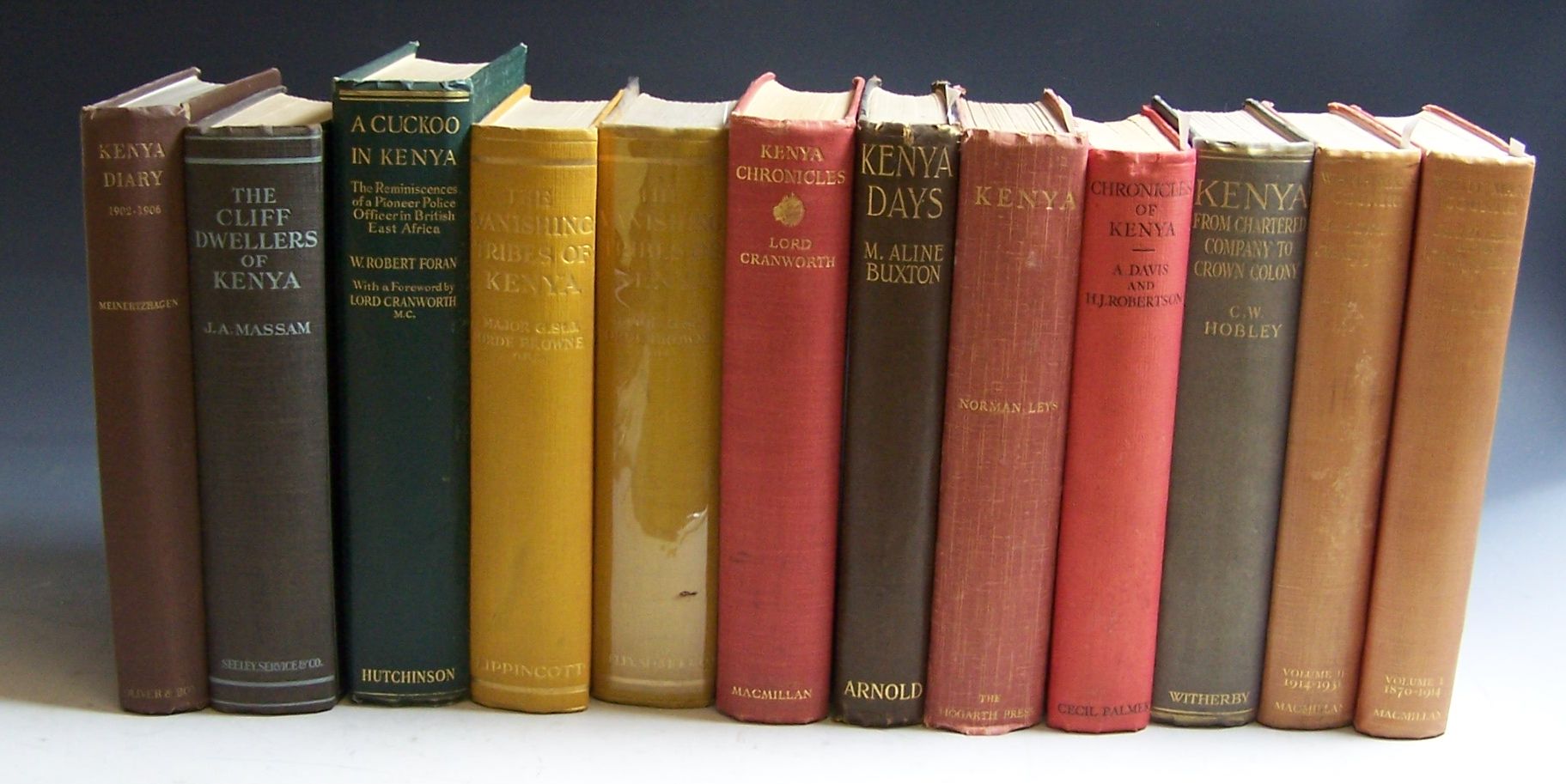 Kenya Diary 1902-1906. Edinburgh, 1957. 8vo, plates, original brown cloth gilt, ink inscription on front endpaper; Massam, J.A. The cliff dwellers of Kenya. London, 1927. 8vo, frontispiece, folding map, plates, orignal black cloth, some foxing; Foran, W. Robert A cuckoo in Kenya. London, 1936. 8vo, publisher's presentation copy [ink stamp on title], frontispiece, plates, original cloth gilt, some rubbing, foxing; Browne, Major G. St. J. Orde The vanishing tribes of Kenya. Philadelphia, 1925. 8vo, frontispiece, plates, original yellow cloth gilt, foxing to title page and another copy; Cranworth, Lord Kenya chronicles. London, 1939. 8vo, frontispiece, plates, original red cloth gilt; Huxley, Elspeth White man's country. London, 1935. 8vo, 2 volumes, portrait frontispiece, plates, folding maps, original red cloth gilt, backstrips faded; and 4 others (12)
