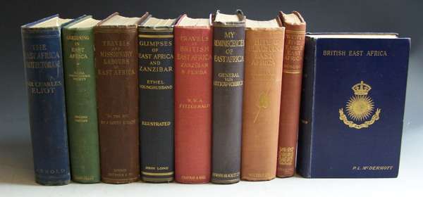 Glimpses of East Africa and Zanzibar. London, 1910. 8vo, frontispiece, plates, original blue cloth gilt, foxing to page edges, blank bookplate on front pastedown; Fitzgerald, William Walter Augustine Travels in the coastlands of British East Africa and the islands of Zanzibar and Pemba. London, 1898. 8vo, portrait frontispiece, 6 maps [4 folding, with repairs], original red cloth gilt, bookplate; Lettow-Vonbeck, General von My reminiscences of East Africa. London, [no date]. 8vo, plates and maps, original blue cloth gilt, backstrip faded, interior clean; McDermott, P.L. British East Africa. London, 1895. Second edition, 8vo, portrait frontispiece, original blue cloth gilt, rubbing to edges; Norden, Hermann White and black in East Africa. London, 1924. 8vo, frontispiece, folding map, original cloth gilt, backstrip faded, foxing to page edges; Roscoe, John Twenty-Five years in East Africa. Cambridge, 1921. 8vo, plates, original cloth gilt, foxing; Mendelssohn, Sidney South African bibliography. Cambridge, MA., [no date]. Reprint of 1910 edition, one of 175 copies, 8vo, 2 volumes, original cloth gilt; and 11 others (19)