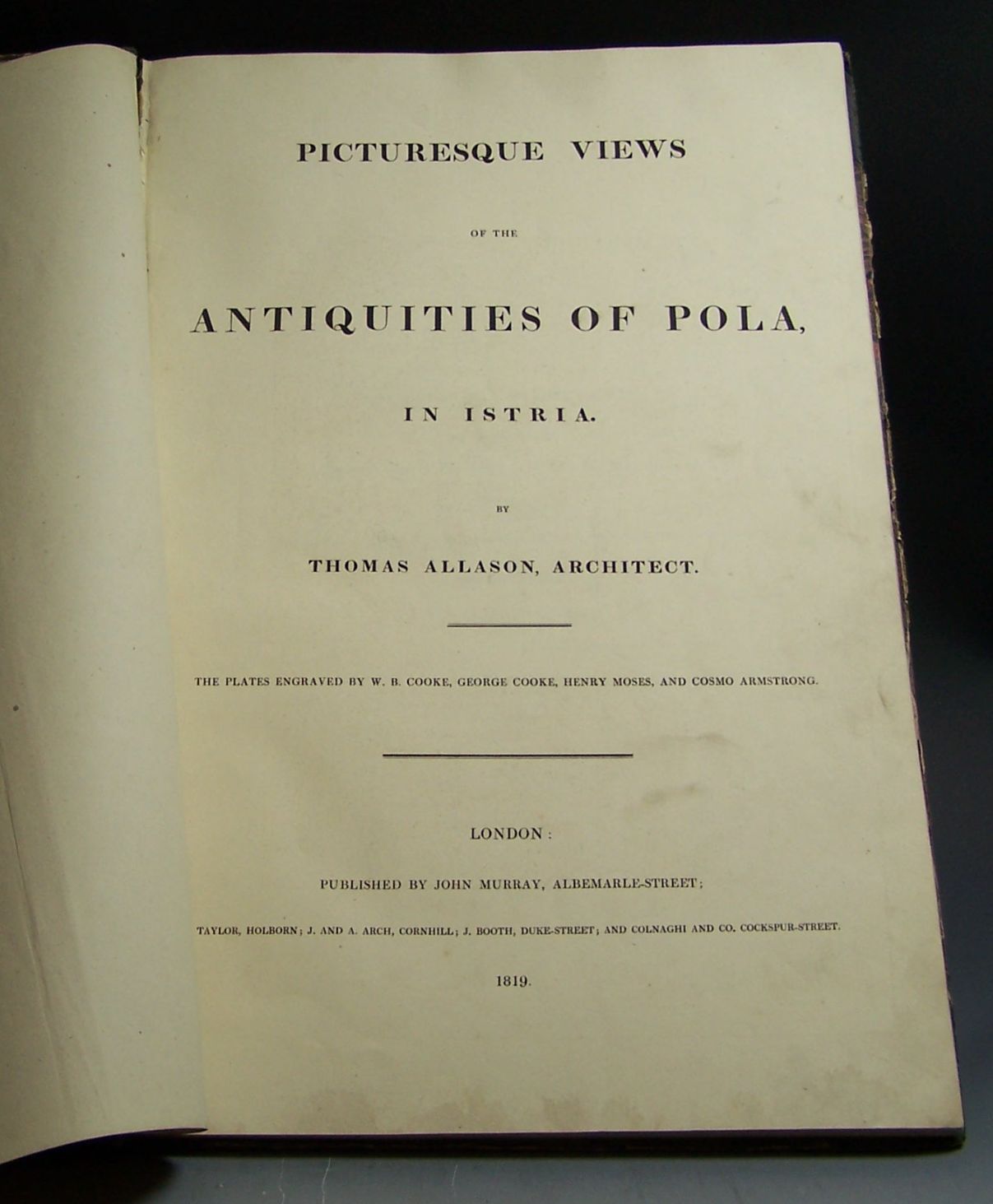 Picturesque views of the antiquities of Pola, in Istria. London: John Murray, 1819. First edition, folio, 10 engraved plates, 4 engraved vignettes, contemporary green half roan, one plate dampstained, some light dust-soiling, binding worn