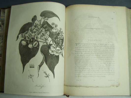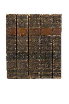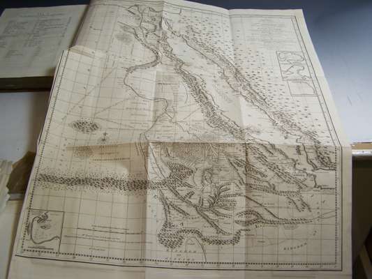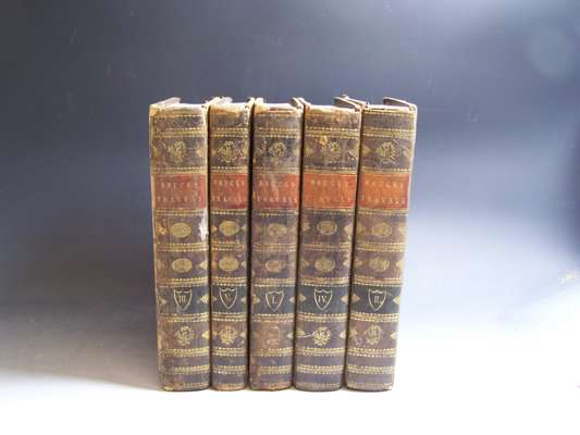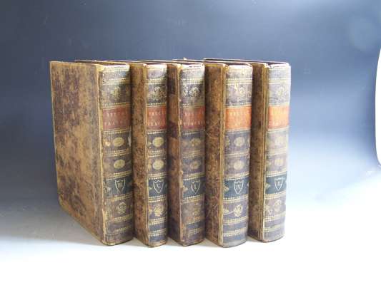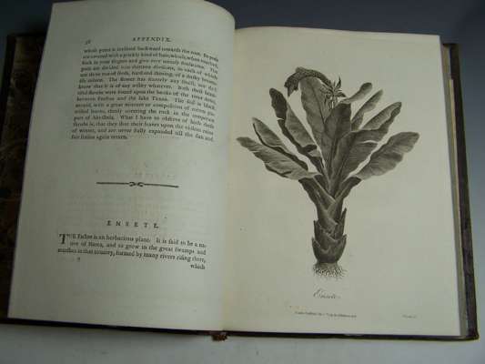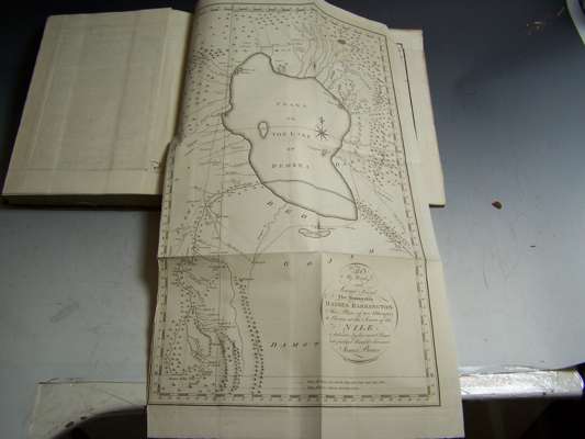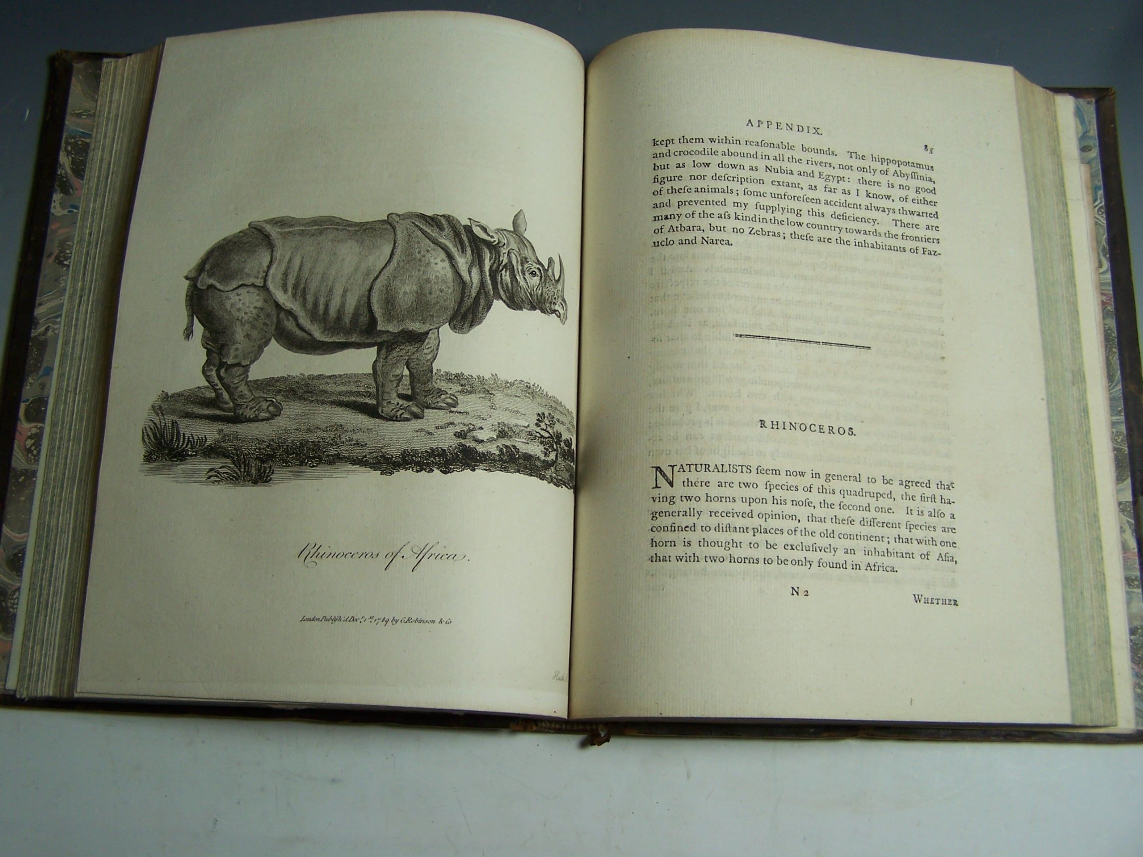 Travels to discover the source of the Nile, in the years 1768... 1773. Edinburgh: printed by J. Ruthven, 1790. First edition, 5 volumes, 4to, 3 engraved plans, 3 folding maps and 55 engraved plates, 4 leaves showing Ethiopian dialects, titles with engraved vignette, half-titles in volumes 1-4, contemporary sprinkled calf, spines gilt, red morocco lettering-pieces, black morocco volume-pieces, two joints repaired, head of spines rubbed, very minor worming to extreme margin of first few leaves of volume 1, plates and maps clean, short tear to one folding map, without loss