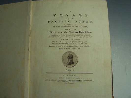 A voyage to the Pacific Ocean. London: printed by H. Hughs, 1785. Third edition, 4to, 3 [of 4] volumes, lacking Atlas, 24 maps and charts, all three volumes uniformly bound in contemporary full calf gilt, black labels, boards loose, backstrips worn, bookplates, some occasional foxing and offsettting (3)