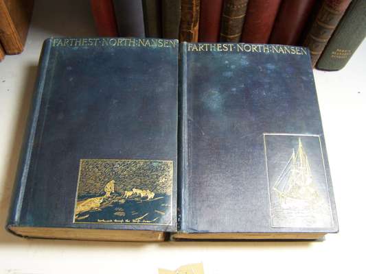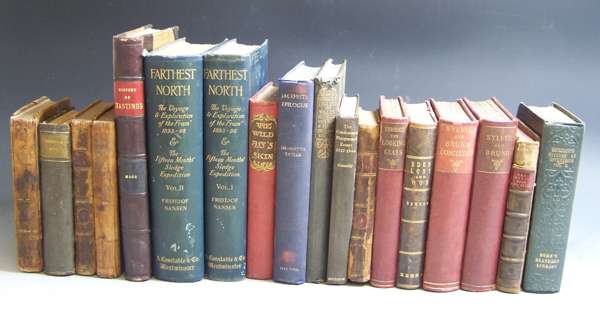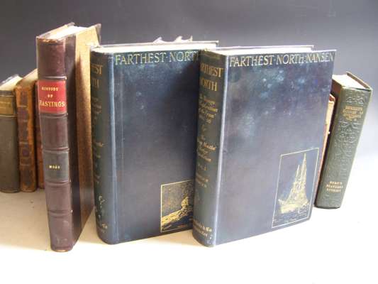 The history and antiquities of the town and port of Hastings. London: W.G. Moss, 1824. 8vo, folding plan and 19 proof plates on india paper, list of subscribers, maroon half morocco, uncut; Nansen, Fridtjof Farthest North. Westminster: A. Constable, 1897. 2 volumes, 8vo, plates, folding map, original cloth gilt, spines neatly recased; and 14 others, miscellaneous (17)