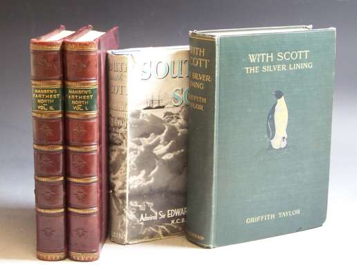 With Scott: the silver lining. London: Smith, Elder & Co., 1916. First edition, 8vo, presentation copy [blind stamp on title], half title, portrait frontispiece, 2 folding maps, plates, original green cloth gilt, some bumping to corners; Nansen, Fridtjof Farthest North. London, 1898. 8vo, 2 volumes, portrait frontispiece, plates, folding map, later half calf gilt, rubbed at edges; Evans, Sir Edward South with Scott. London and Glasgow, [no date]. 8vo, portrait frontispiece, folding map, illustrated with photographs by Herbert Ponting, original blue cloth gilt, dustwrapper, chipped at edges (4)