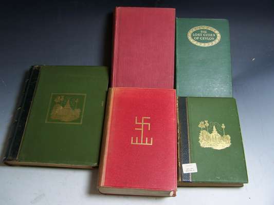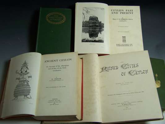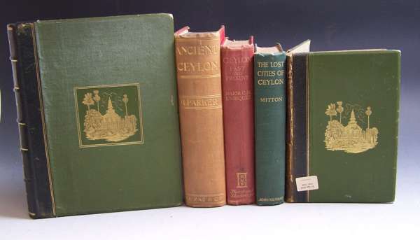 The ruined cities of Ceylon. London: Sampson Low, 1897. First edition, presentation copy from the principal officers of the island to the Governor-General of Ceylon, 4to, 47 photographic plates, illustrations, original roan-backed pictorial cloth gilt, g.e., slightly foxed, neatly rebacked, a little rubbed; Parker, H. Ancient Ceylon. London: 1909. 8vo, plates & illustrations, original cloth gilt, spine faded, library stamp on title verso; Cave, H.W. The ruined cities of Ceylon. London: 1904. Third edition, 8vo, original morocco-backed cloth, spine very worn; Enriquez, C.M. Ceylon past and present. London: [c.1927]. 8vo, original cloth; Mitton, G.E. The lost cities of Ceylon. London, 1916. 8vo, frontispiece, original green cloth gilt (5)