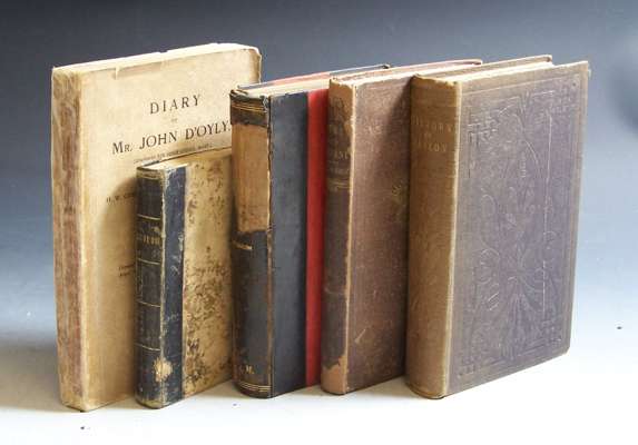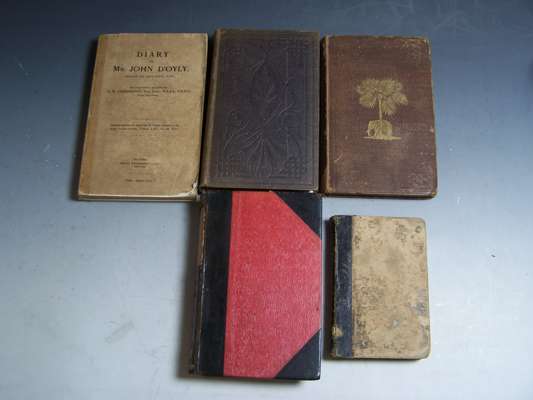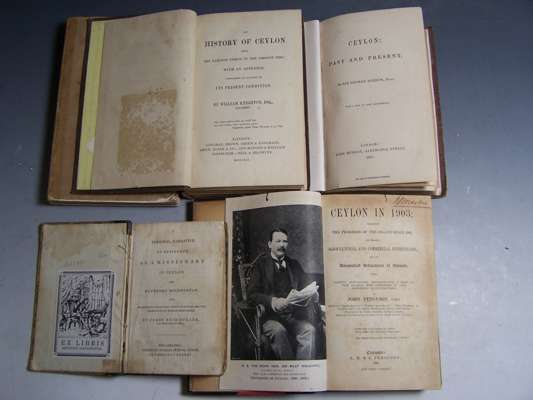 Ceylon. Past and present. London: J. Murray, 1857. First edition, 8vo, folding engraved map by John Arrowsmith, advertisements at end, original cloth gilt, rebacked retaining most of the original spine, rubbed; Knighton, William The history of Ceylon from the earliest period to the present time. London, 1845. First edition, 8vo, original cloth, some fading to spine, some foxing; Eckard, J.R. Personal narrative of residence as a missionary in Ceylon. Philadelphia: American Sunday School Union, [c.1844]. 12mo, roan-backed boards, spotted, worn; Ferguson, J. Ceylon in 1903. Colombo: 1903. 8vo, plates, half morocco, spine defective; D'Oyly, John. Diary. Colombo: 1917. 8vo, original wrappers, repaired (5)