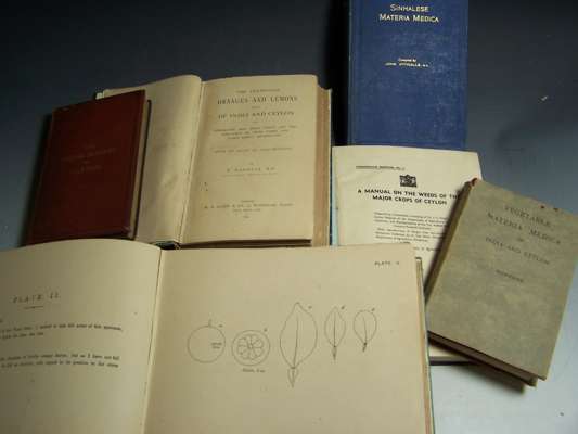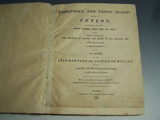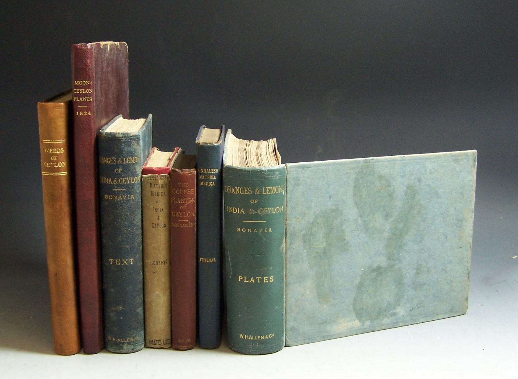 Indigenous and exotic plants growing in Ceylon. Colombo: Wesleyan Mission Press, 1824. First edition, 4to, text in Roman and Sinhalese letter, [Pritzel 6400], (lacks Sinhalese title, pp.39/40 in part 2 and pp.17/18 in part 3, last 3 leaves somewhat defective land laminated, many tears, some repaired, appear very brittle, later red roan, rebacked, covers worn; Bonavia, E. The cultivated oranges and lemons of India and Ceylon. London: W.H. Allen, 1890. 2 volumes (text and plates), 8vo and oblong 8vo, 259 lithographed plates only (of 269), some defective and repaired with loss, many torn and repaired, some bound out of place, paper of many of the plates very brittle, some foxing, original cloth, very stained and rubbed; Sabonadiere, W. The coffee-planter of Ceylon. London: 1870. Second edition, 8vo, 3 engraved plates, original cloth; Dept. of Agriculture, Ceylon A manual on the weeds of the major crops of Ceylon. 1951. 4to, coloured plates, half calf; and 2 others (7)