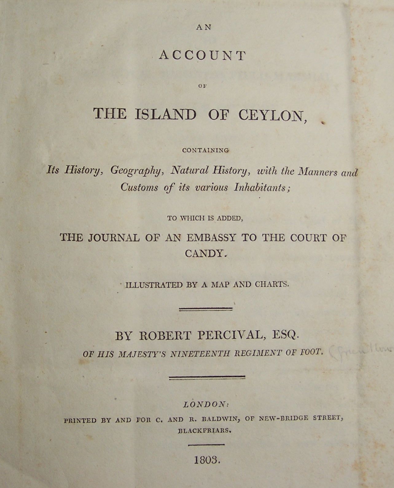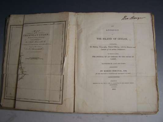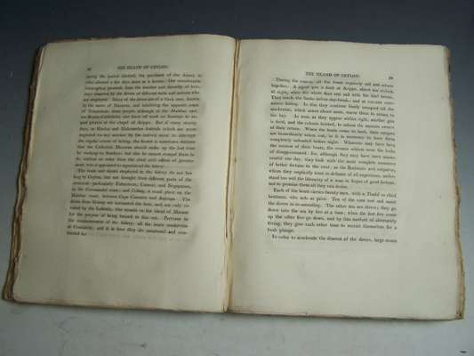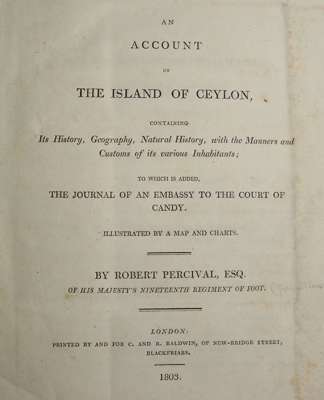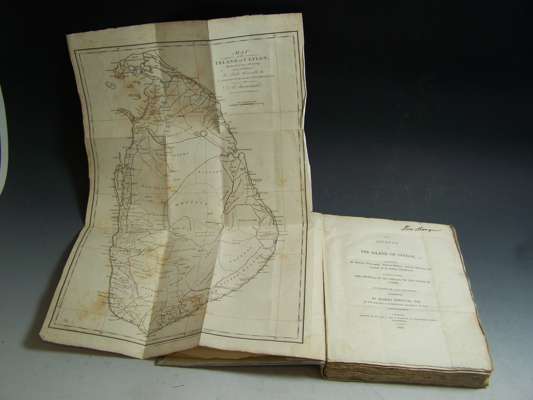 An account of the island of Ceylon. London: C. & R. Baldwin, 1803. First edition, 4to, folding engraved map by Arrowsmith hand-coloured in outline, and 3 folding engraved charts, original boards, uncut, a few small spots and stains, neatly rebacked