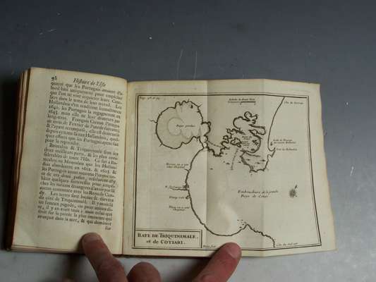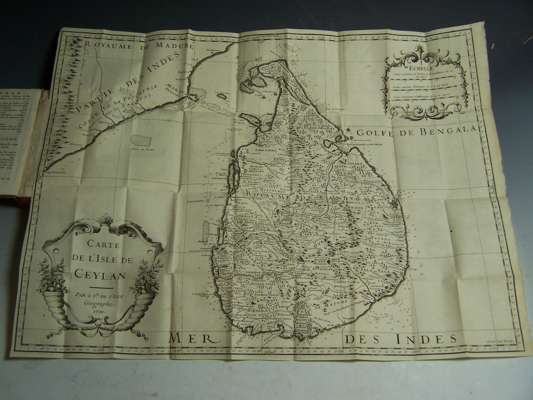 Historia de l'isle de [C]eylan. Amsterdam: J.L. Delorme, 1701. Second edition, 12mo, title printed in red and black, large folding engraved map by Berey, 7 folding plates and plans, with the 2 final blanks, the last one pasted down, early 19th century boards, piece missing from title with loss of one letter