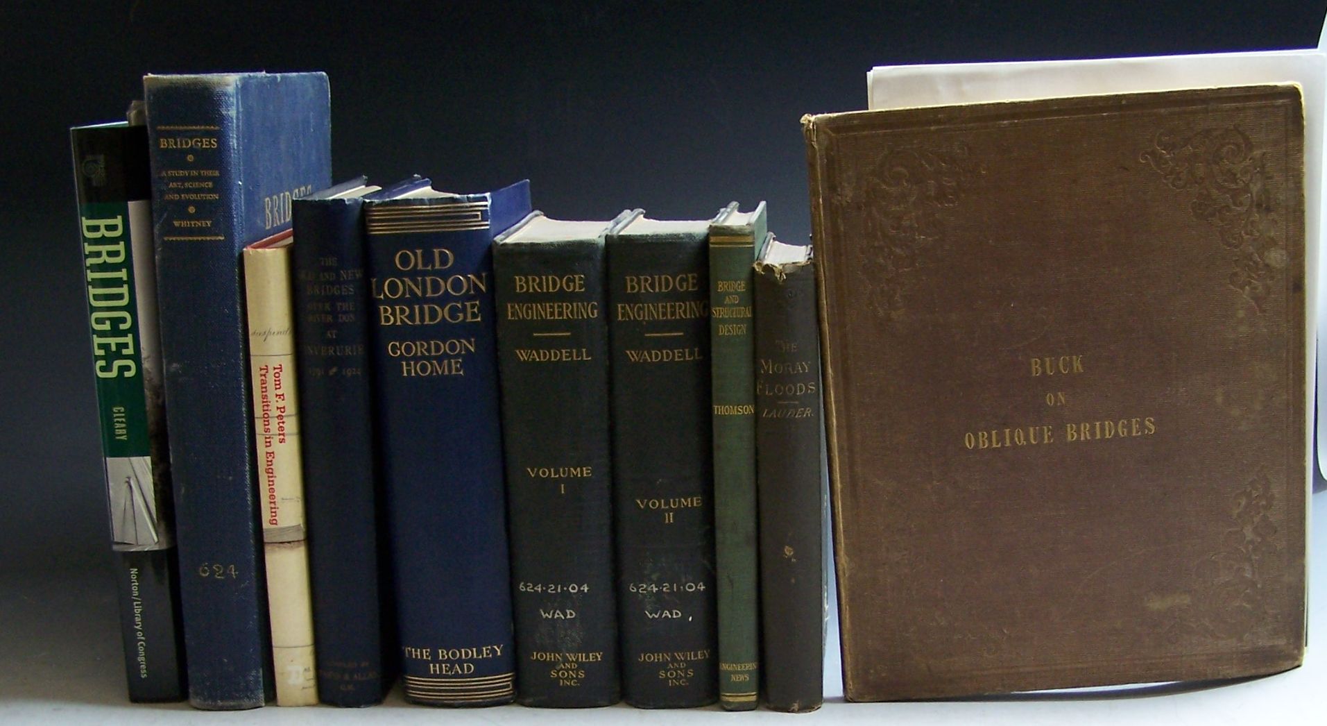 A practical and theoretical essay on oblique bridges. London: John Weale, 1839. 4to, 12 plates [some folding], original cloth gilt, some rubbing to edges, contemporary ink inscription to title; Waddell, J.A.L. Bridge engineering. New York, 1916. 8vo, 2 volumes, portrait frontispiece, original cloth gilt, rubbed, ex-library stamps; Thomson, W. Chase Bridge and structural design. New York, 1910. 8vo, folding plates, original green cloth gilt, ink inscription on front pastedown; Whitney, Charles Bridges, a study in their art, science and evolution. New York, 1929. 4to, frontispiece, plates, original cloth gilt, rubbed, damp staining along upper edge; Peters, Tom F. Transitions in engineering. Basel, 1987. Square 8vo, original red cloth, dustwrapper; Inverurie The old and new bridges over the River Don at Inverurie 1791 and 1924. Aberdeen, 1925. 8vo, frontispiece, plates, original blue cloth gilt; Lauder, Sir Thomas Dick The great floods of August 1829. Elgin, 1873. Third edition, 8vo, portrait frontispiece, original cloth gilt, rubbed at edges, bookplate removed; Home, Gordon Old London Bridge. London, 1931. First edition, 8vo, frontispiece, original blue cloth gilt; and 23 others (33)