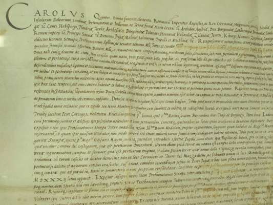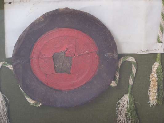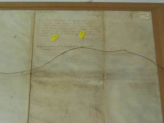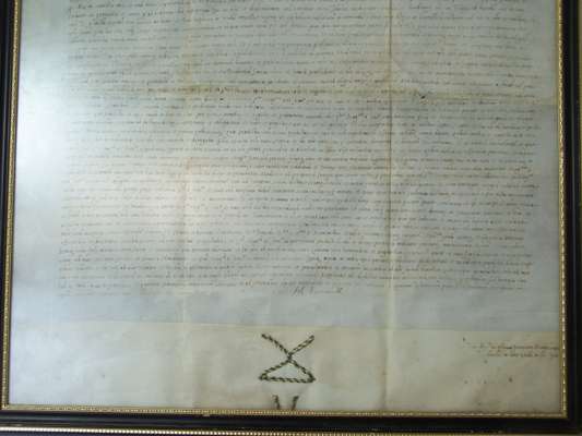 Document on vellum relating to the Sforza, and Tonso de Berghezis, 24 Cotober 1536, signed by Hobernburger, broken red seal attached, 59 x 60cm.; Sforza, Franciscus. Framed document on vellum, dated 1525, 75 x 57 cm.; both framed and glazed (2)