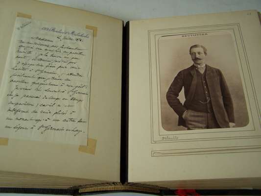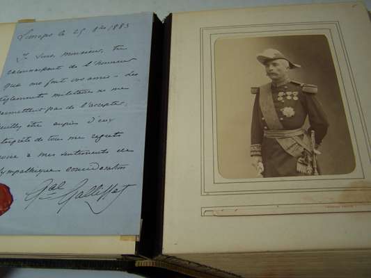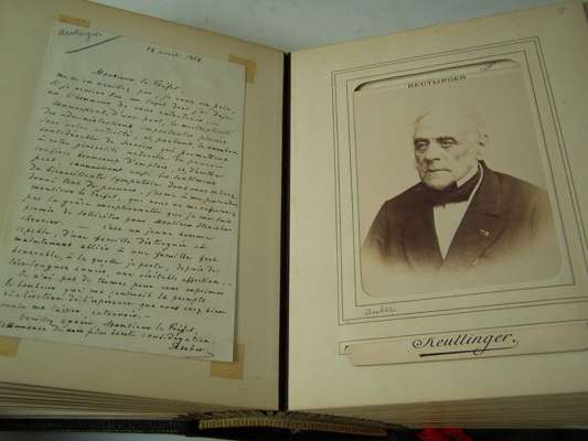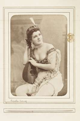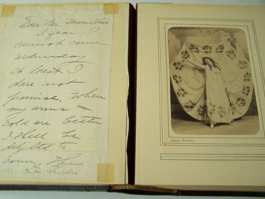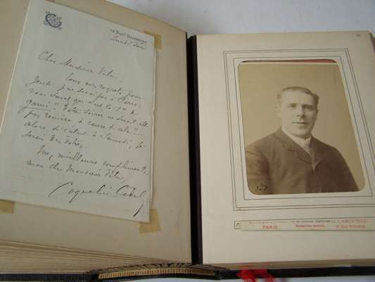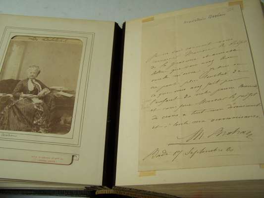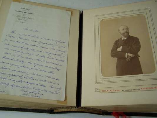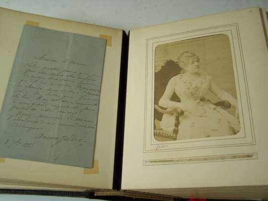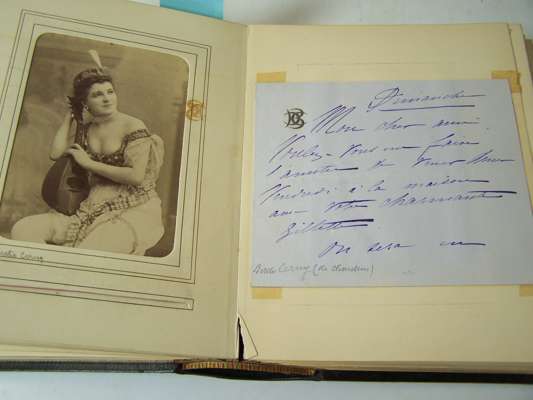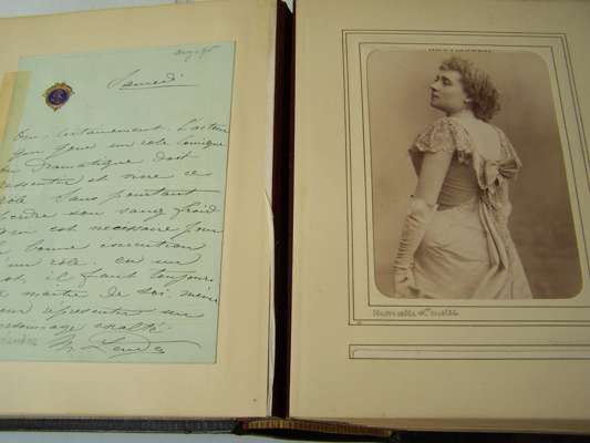 Two albums of letters comprising autograph letter or note, mostly from French actors and actresses, including Ellen Terry, Offenbach, Galli-Marie, General Gallifet, Blanche Presson, de Lesseps, Madeleine Booker, A.H. Swinburne, Emma Eames, Sanderson, Céline Chaumont, Anne Judie, Réjane, E. Got, A. Dudlay, Nilson, Julie Feyghine, J. Charetie, Marie Rose, E. Detaille, S. Bernard, Taillarde, E. Broisart, C. Carvalho, A. Teissandier, C. Cadel, Saint Saens, G. Sand, Maria Legault, most with cabinet photograph, and others similiar, maroon morocco albums, slightly rubbed, [c.1860] (2)